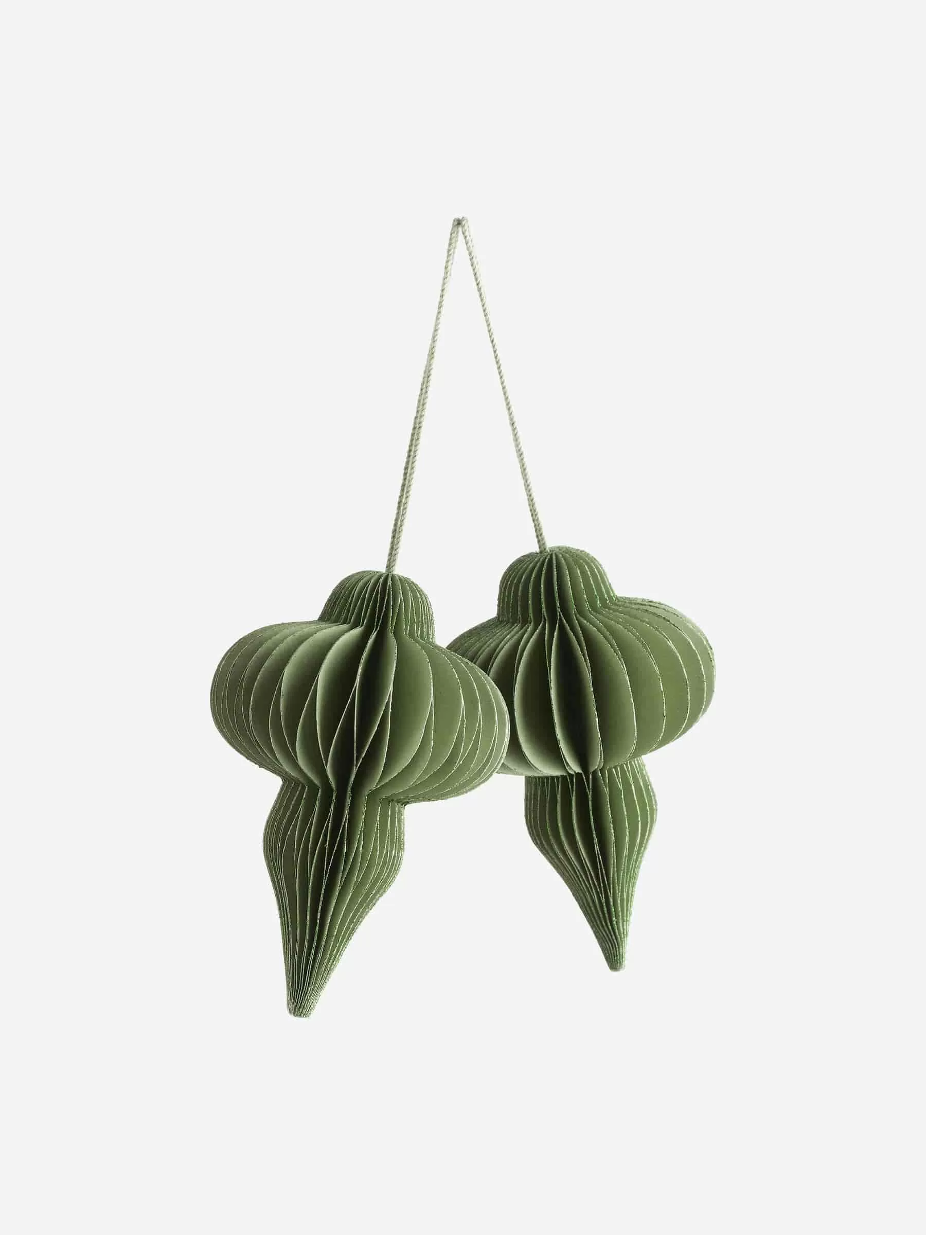 Wabenornamente, handgefertigt aus stabilem Papier. Eine Baumwollschnur zum einfachen Aufhängen. Zweier-Set. Höhe 9 cm.