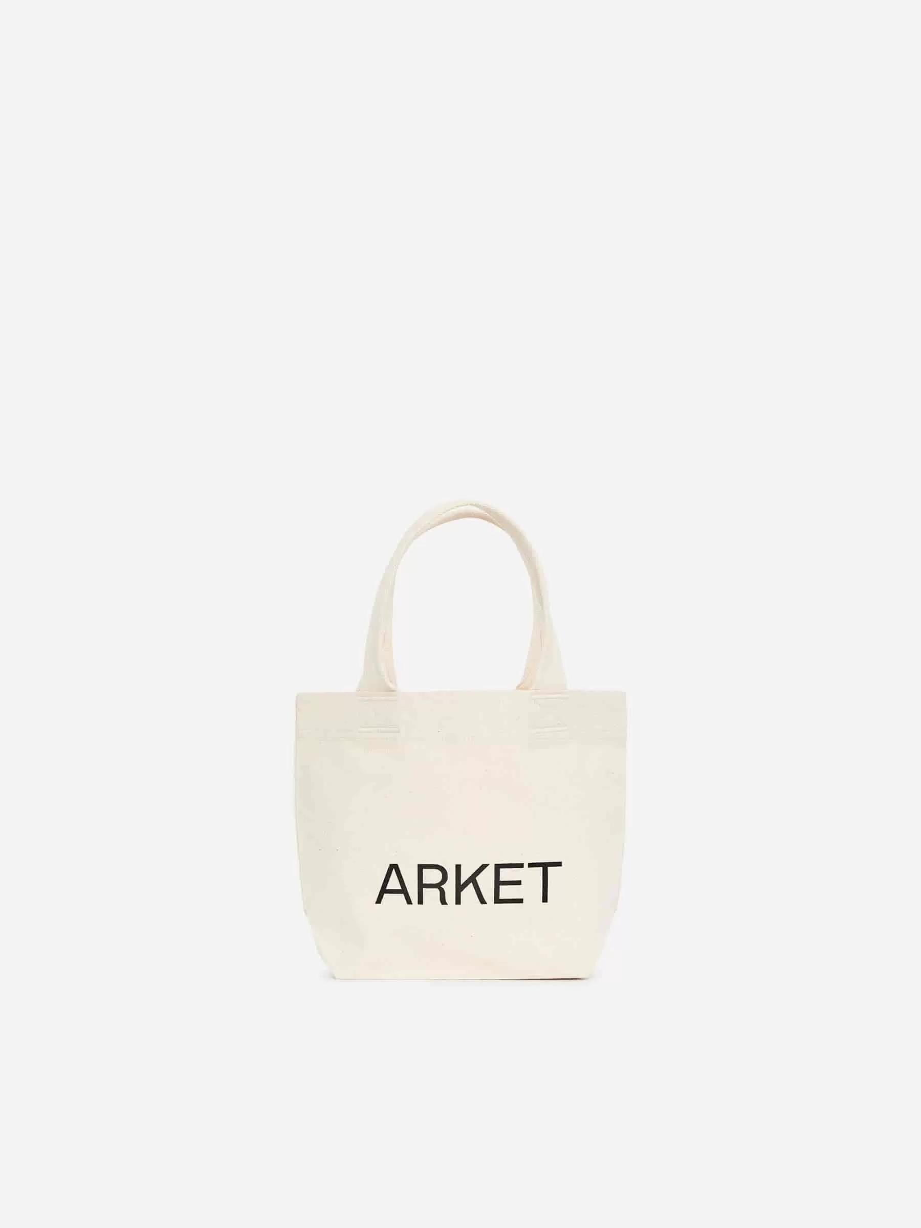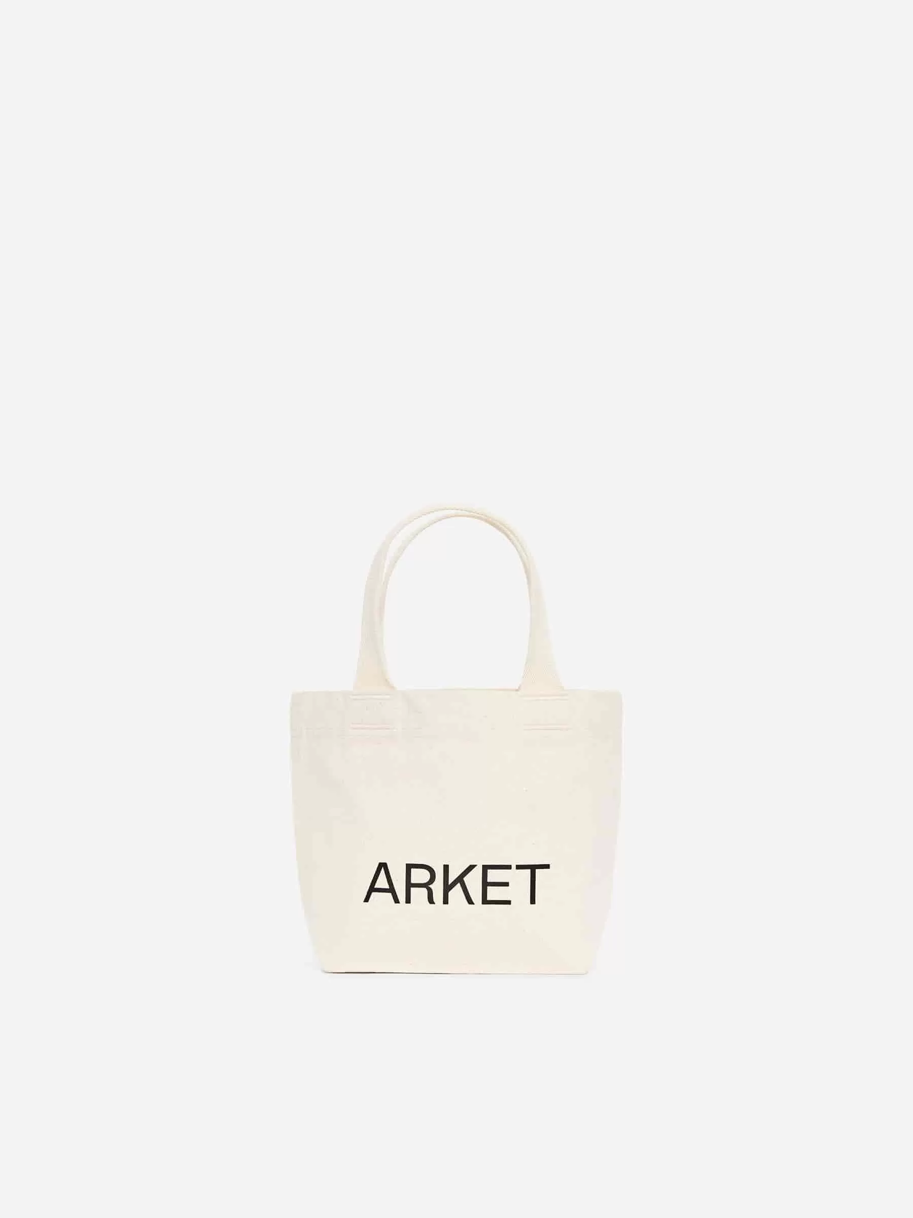 Tragetasche aus Baumwollcanvas mit einseitig aufgedrucktem ARKET-Logo. Eine kleine Tragetasche, perfekt zum Mitnehmen der Lunchbox. Verstärkte Griffe. Abmessungen 21 cm x 12 cm x 24 cm.