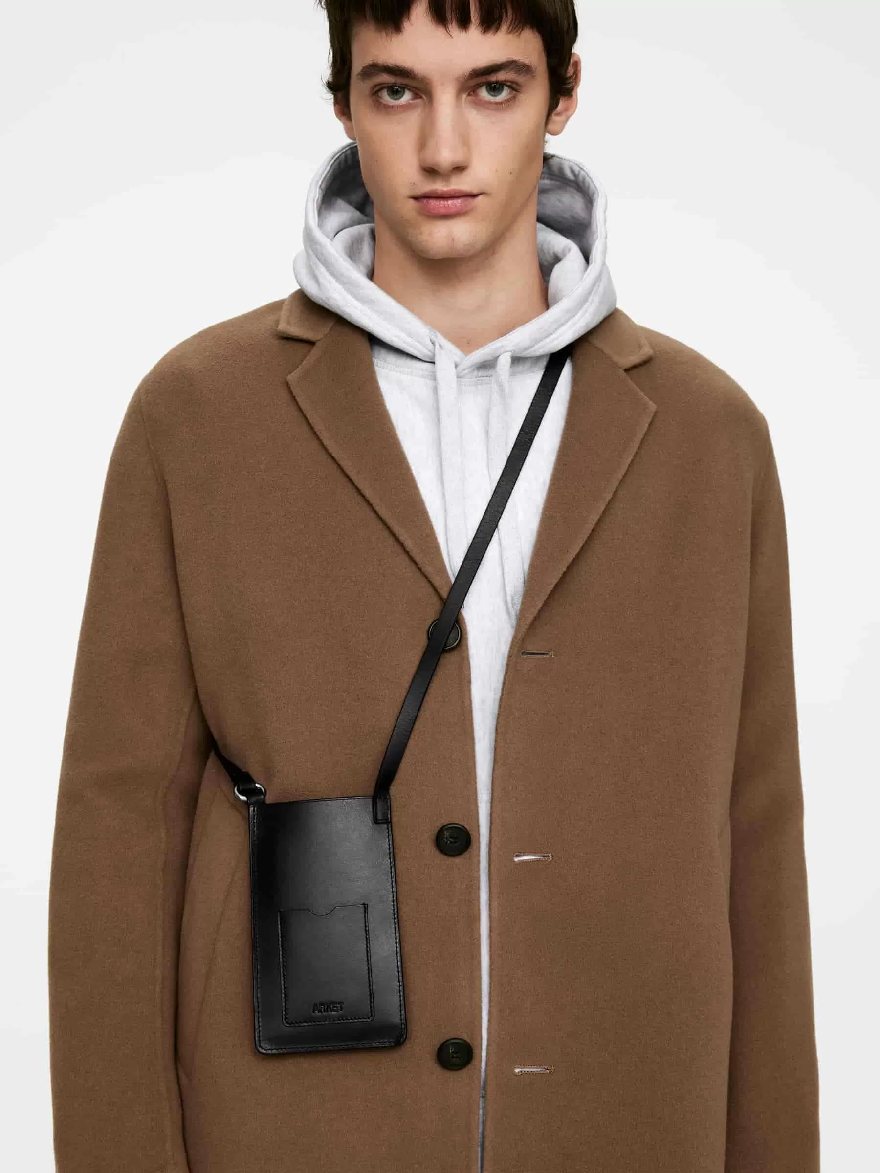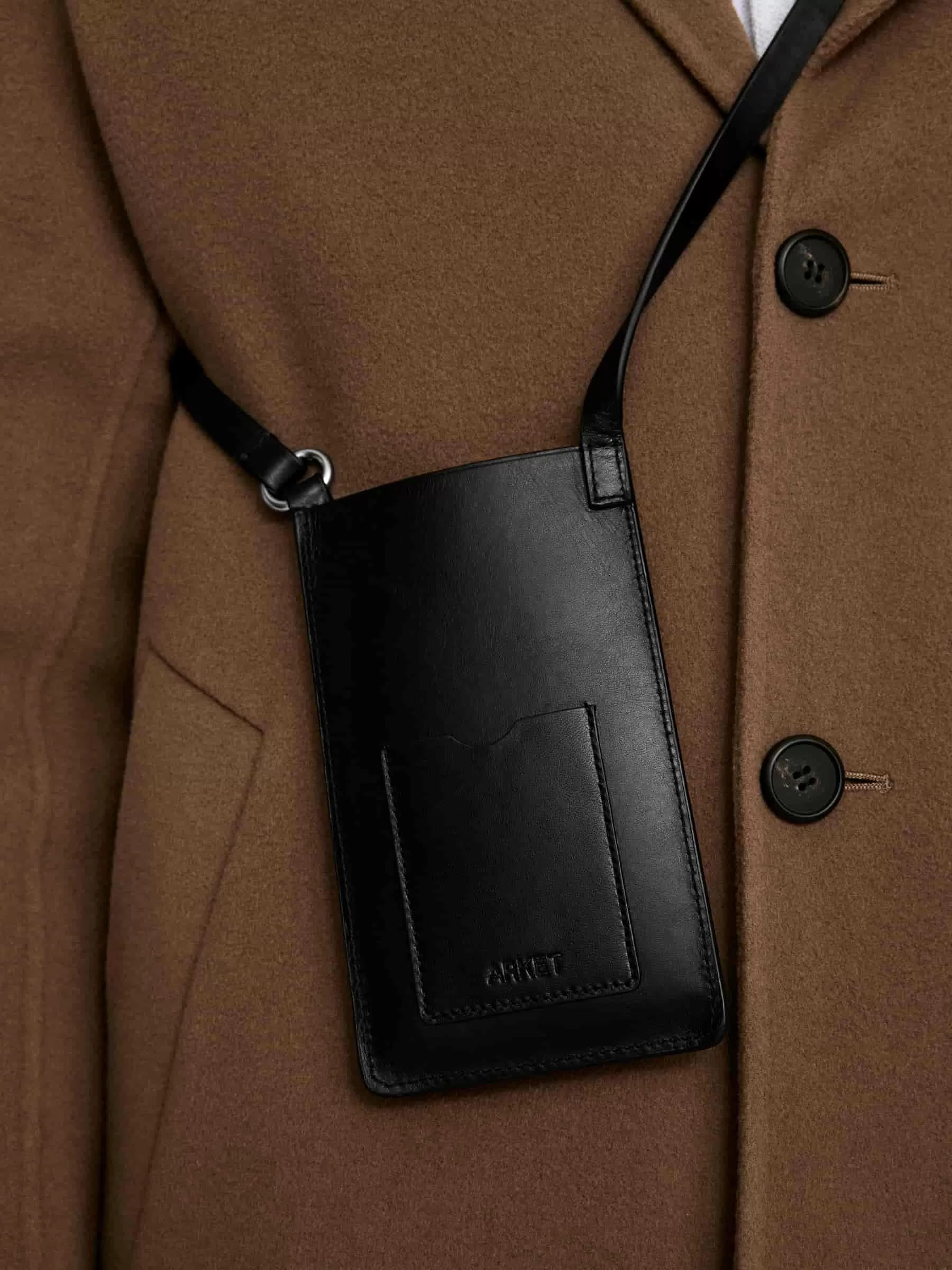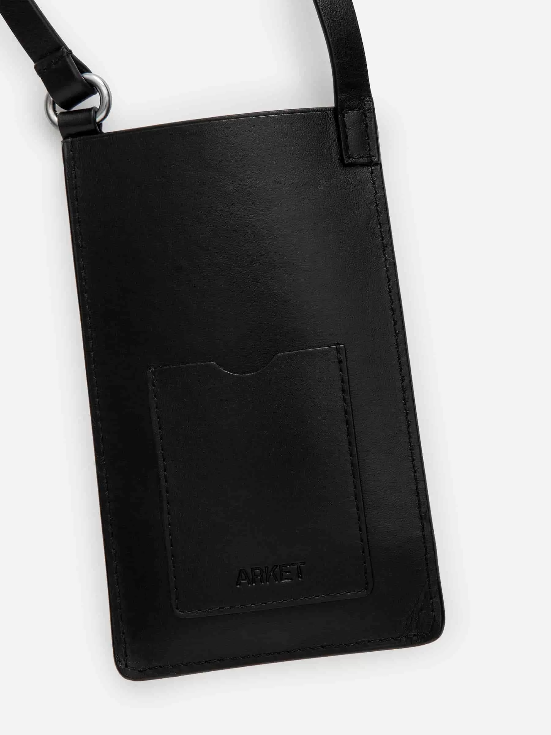Handytasche aus Leder, das einem chromfreien Gerbungsprozess unterzogen wurde. Ausgestattet mit einem verstellbaren Riemen und einem Schlitz für Kreditkarten auf der Rückseite der Tasche. Maße: 17,5 cm x 10 cm.