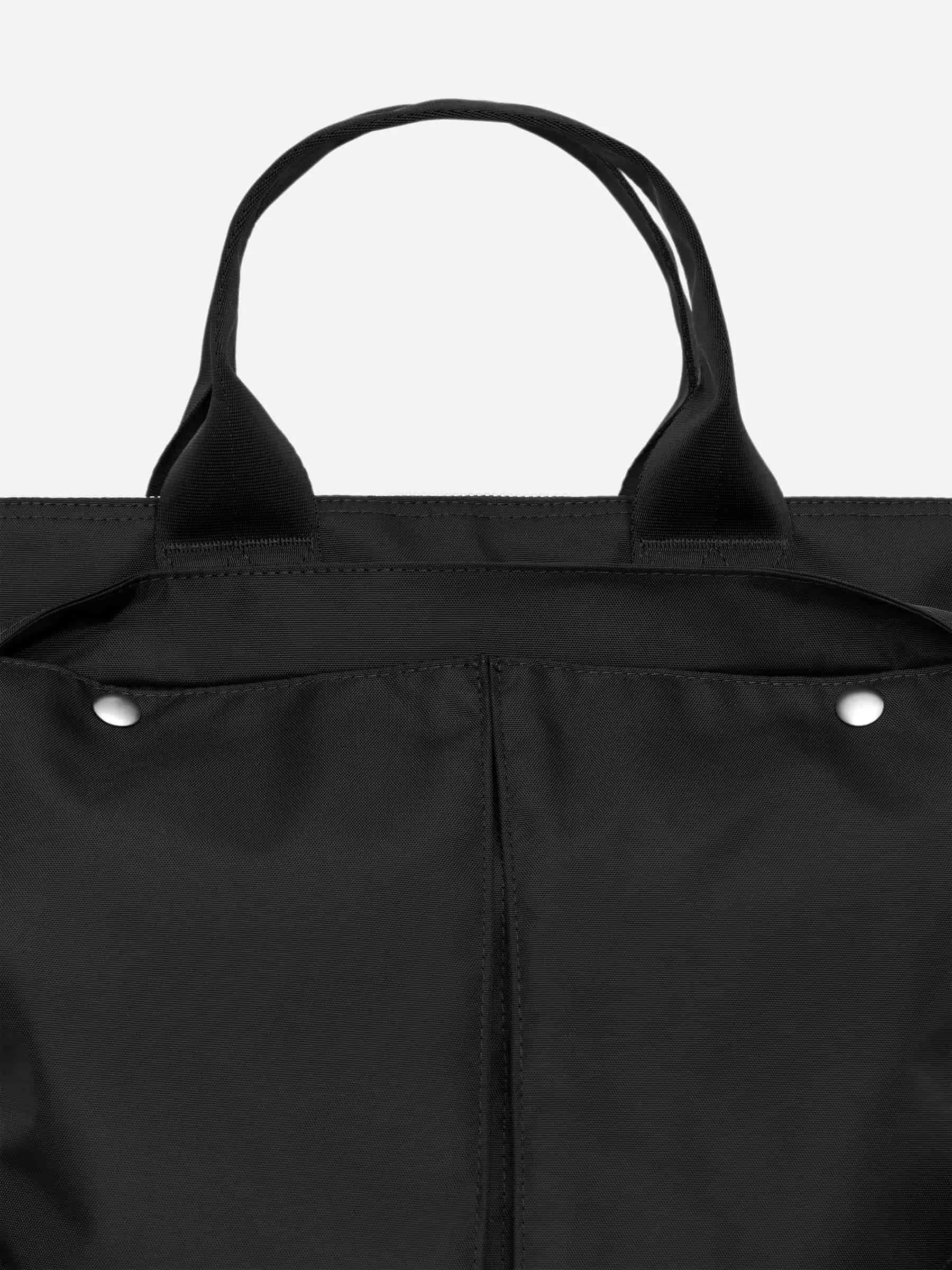 Geräumige Tasche, entwickelt aus einer originalen Flyer-Helmtasche aus den 1960er Jahren. Mit gestepptem Futter und zwei großen Außentaschen mit verdecktem Druckknopfverschluss. Zwei stabile Gurtbandgriffe und ein abnehmbarer Schultergurt. Reißverschluss und eine Innentasche mit Reißverschluss. Maße: 47 cm x 46 cm.