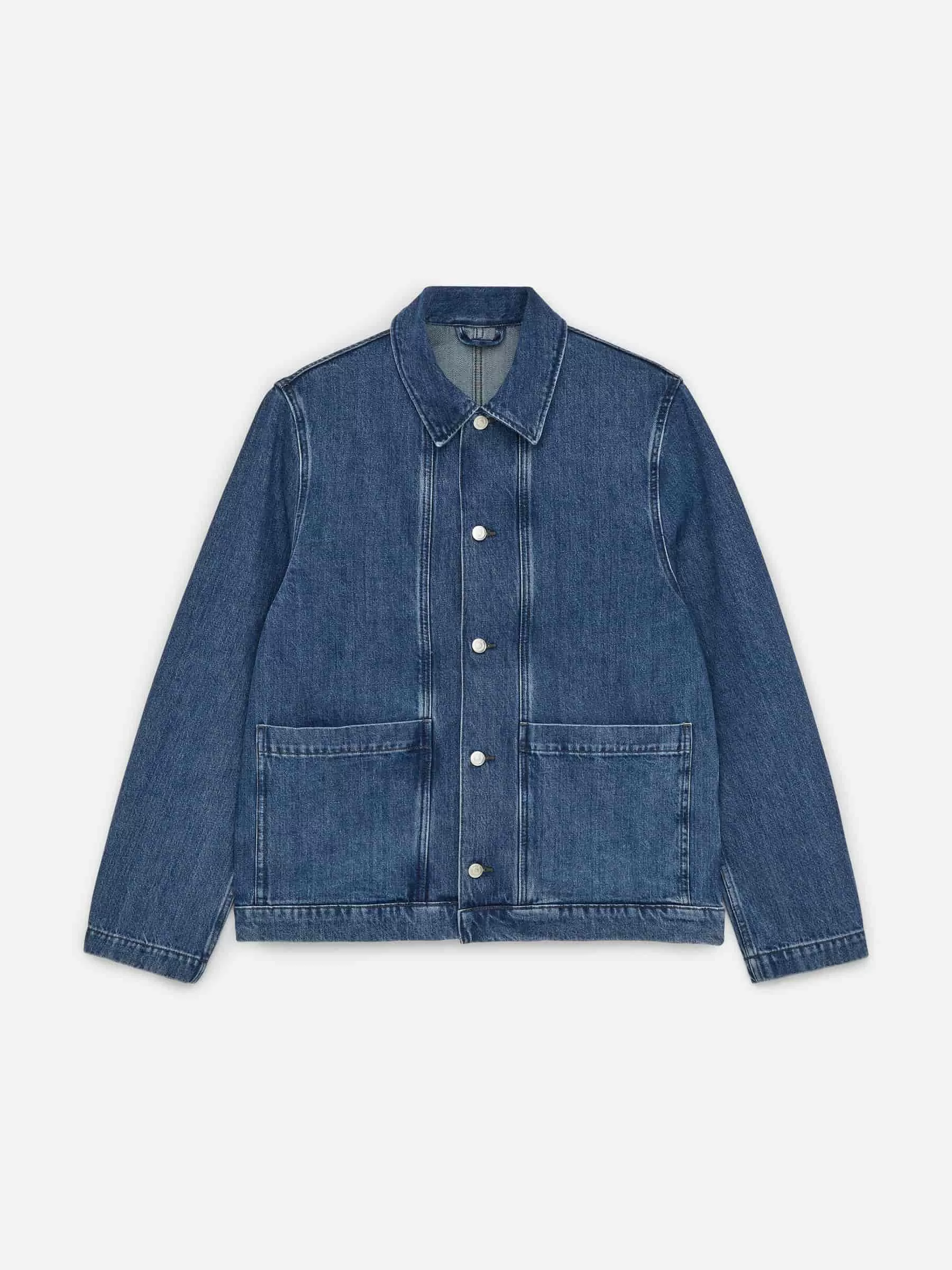 Gerade geschnittenes Jeans-Overshirt mit normalem Kragen, Knopfleiste vorne und zwei großen aufgesetzten Taschen. Kleine aufgesetzte Tasche innen.