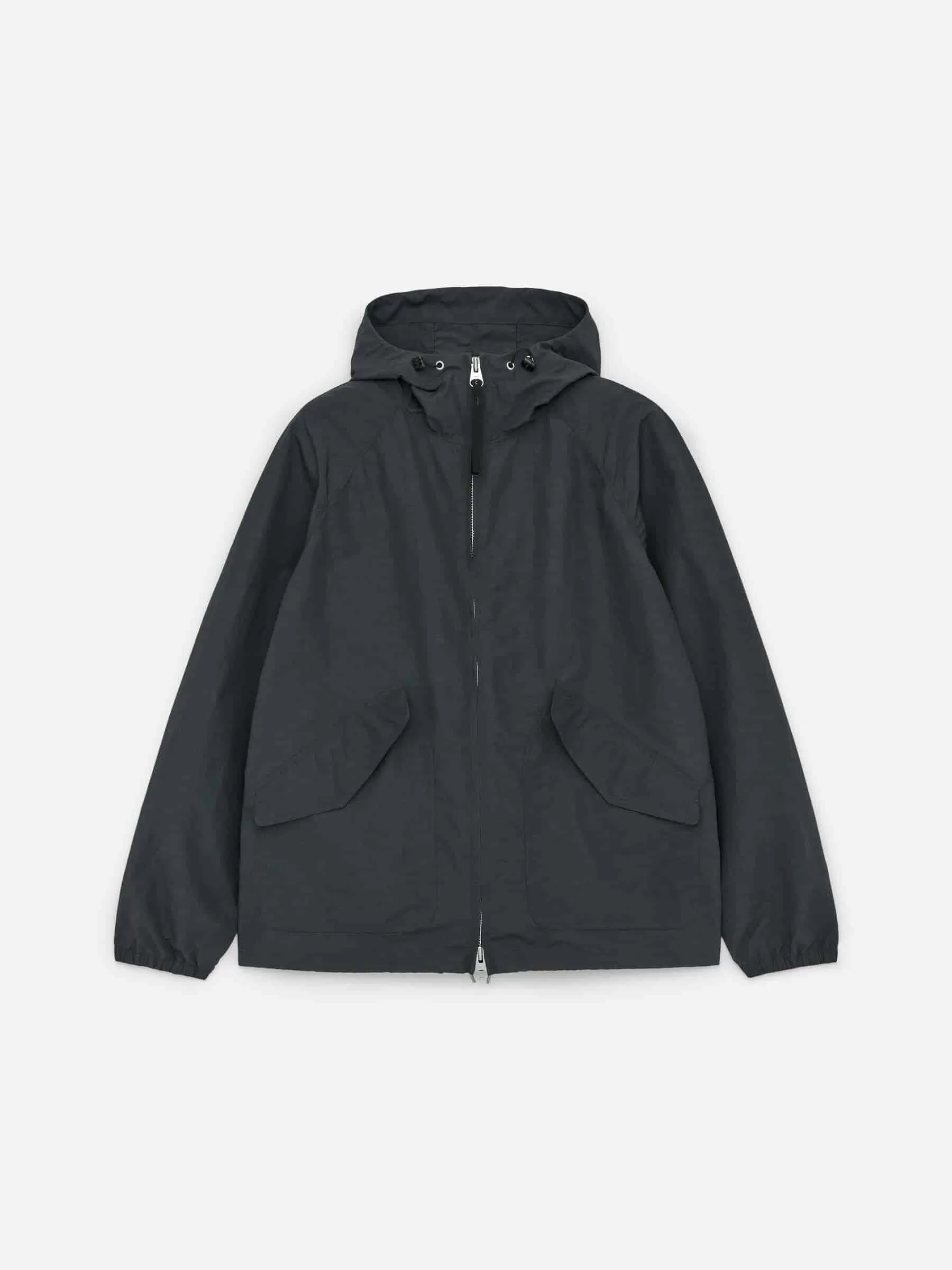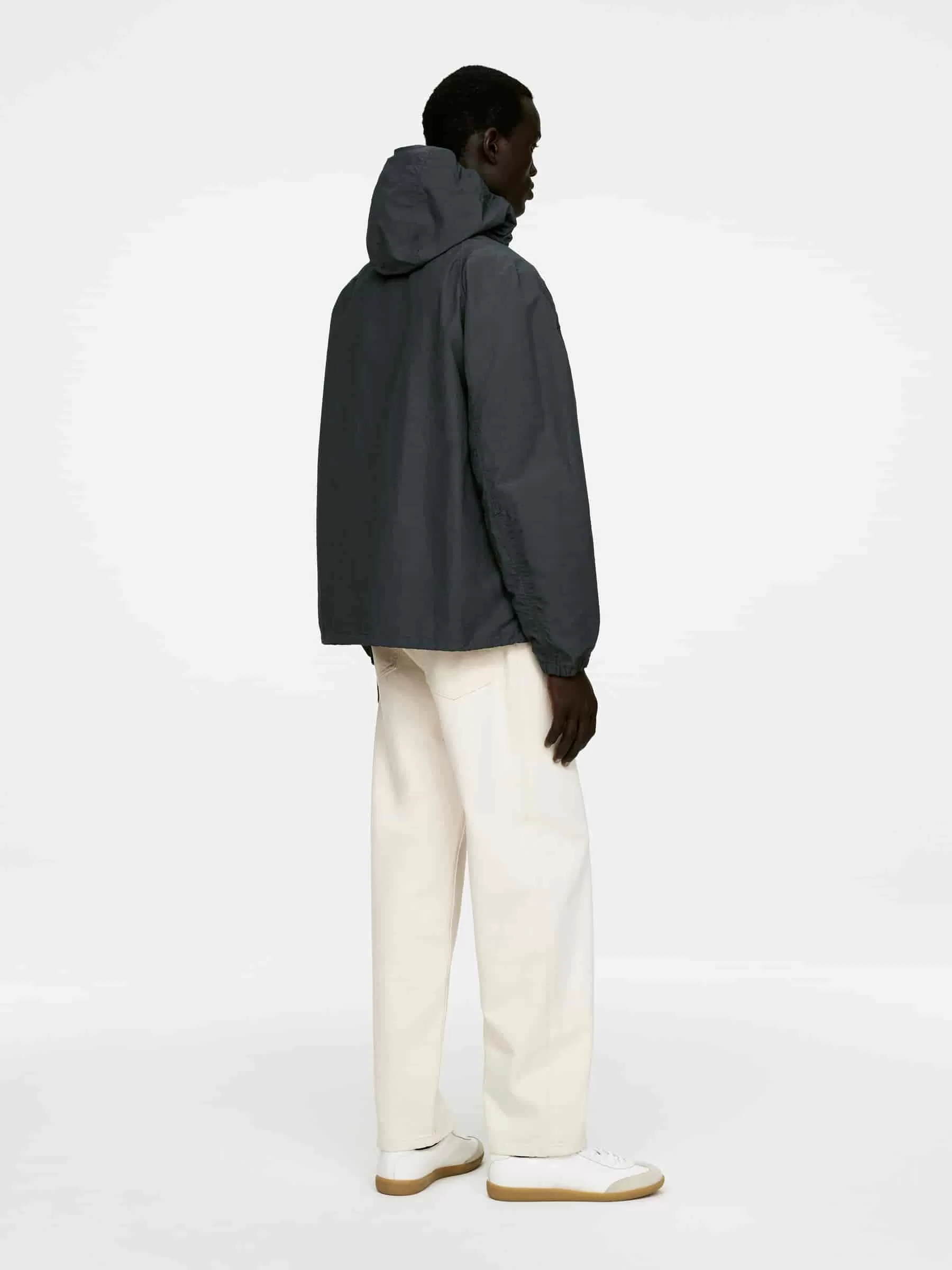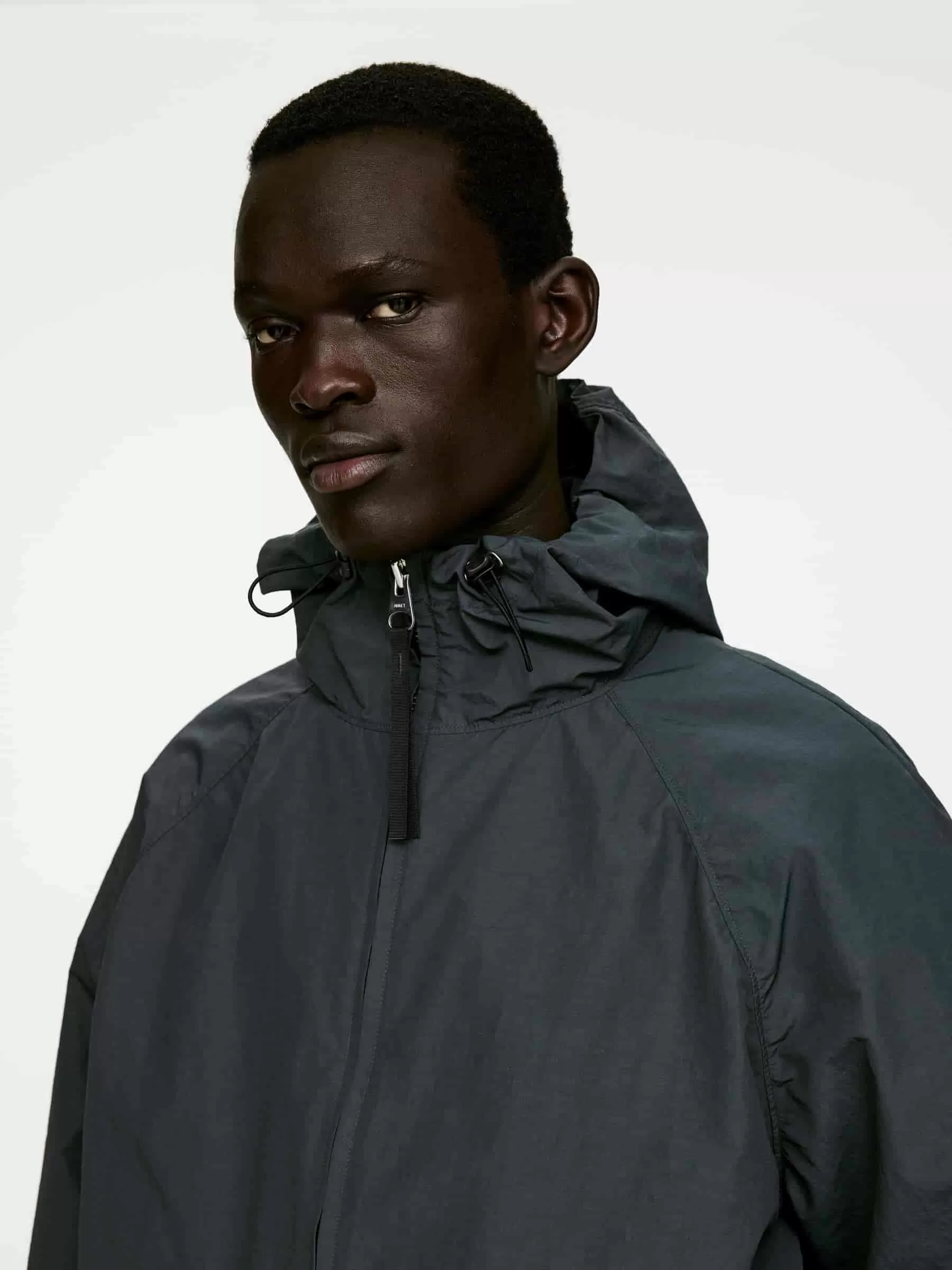 Windjacke aus einer Nylon-Baumwollmischung. Ein ungefütterter Schnitt für eine entspannte Passform. Mit Kapuze, Reißverschluss, Raglanärmeln und zwei großen Taschen. Elastische Bündchen. Verstellbarer Kordelzug am Saum. Kleine Innentasche.