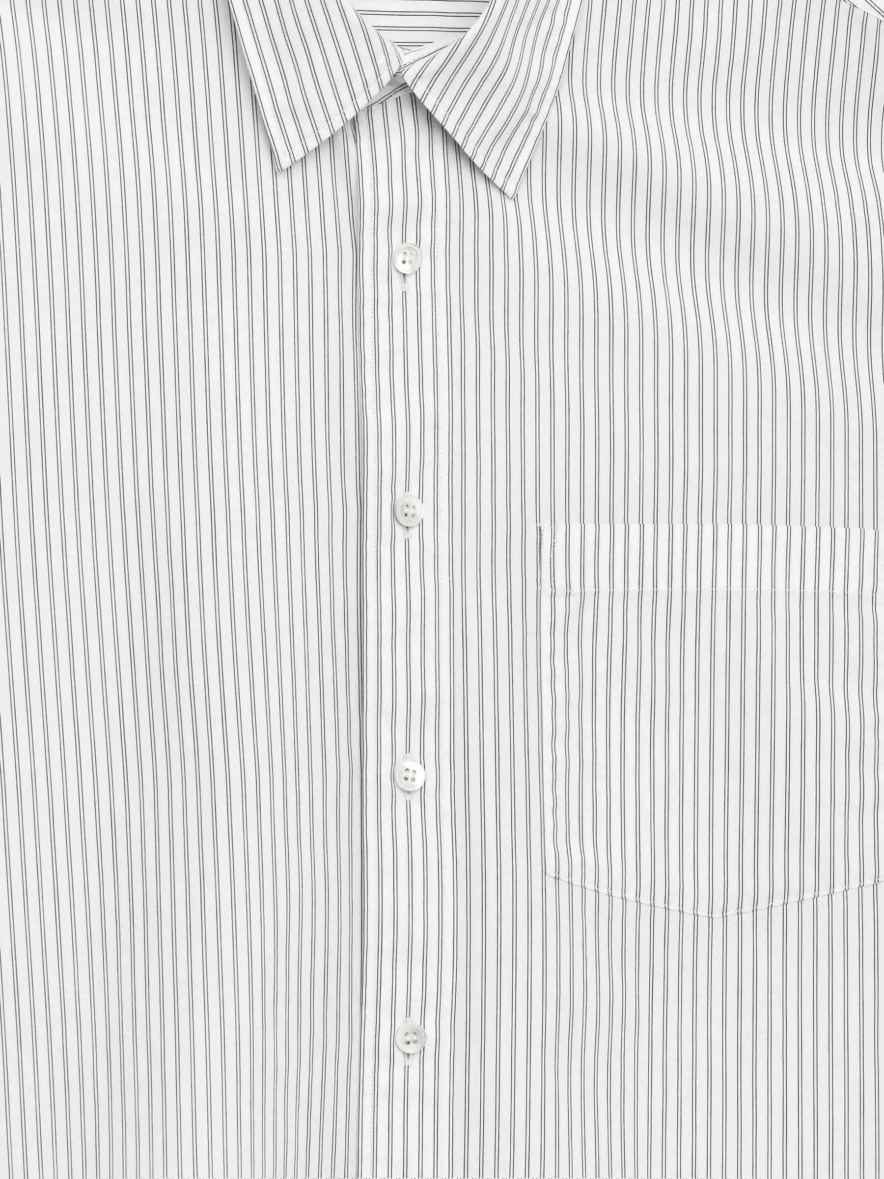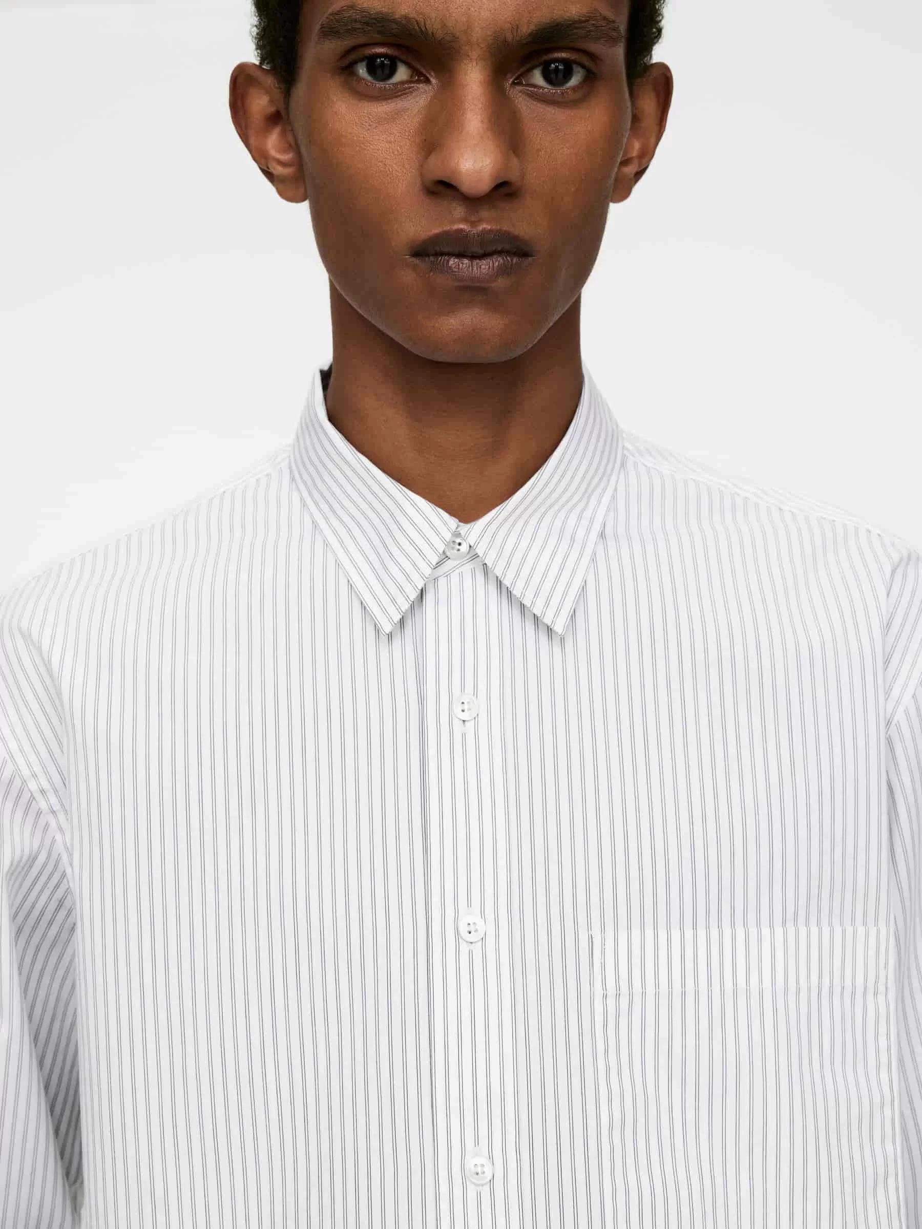 Hemd aus einem Popeline-Stoff aus Baumwolle genäht. Ausgestattet mit einer einzelnen Brusttasche und geknöpften Manschetten. Entspannte Passform.