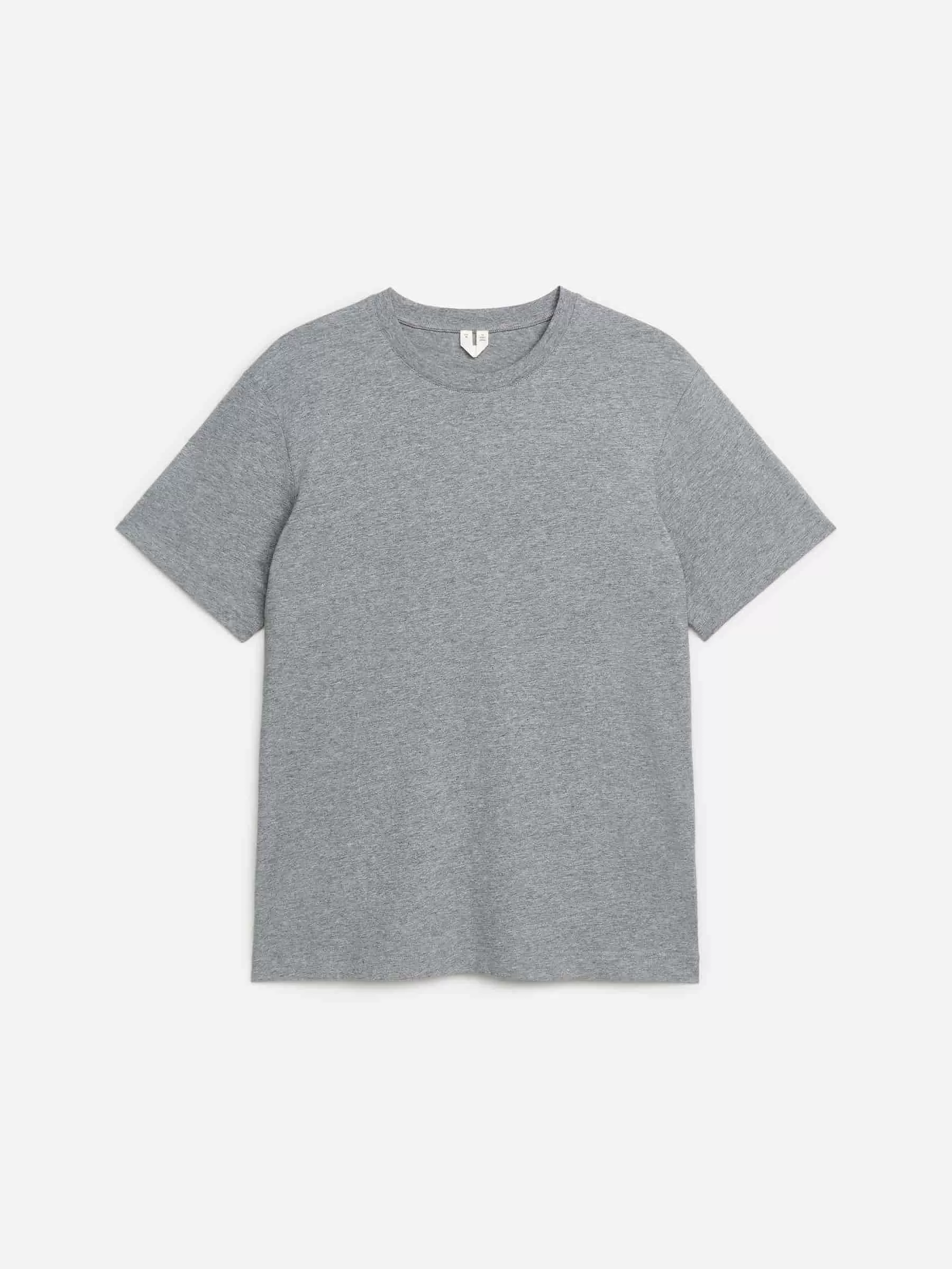 Klassischer T-Shirt-Schnitt mit Rundhalsausschnitt für eine normale Passform. Es besteht aus 170 GSM Single Jersey, was darauf hinweist, dass es das leichteste der Standard-T-Shirts von ARKET ist.