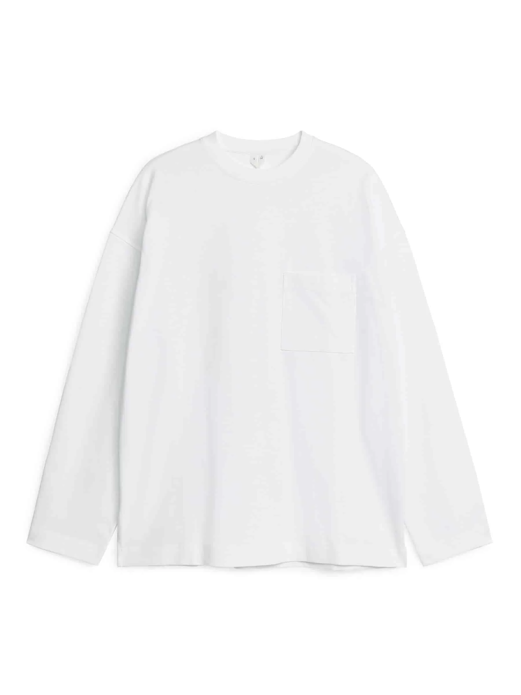 Langarm-T-Shirt in merzerisierter Baumwollqualität. Dieser Stil hat eine entspannte Passform und leicht überschnittene Schultern. Einzelne Brusttasche.