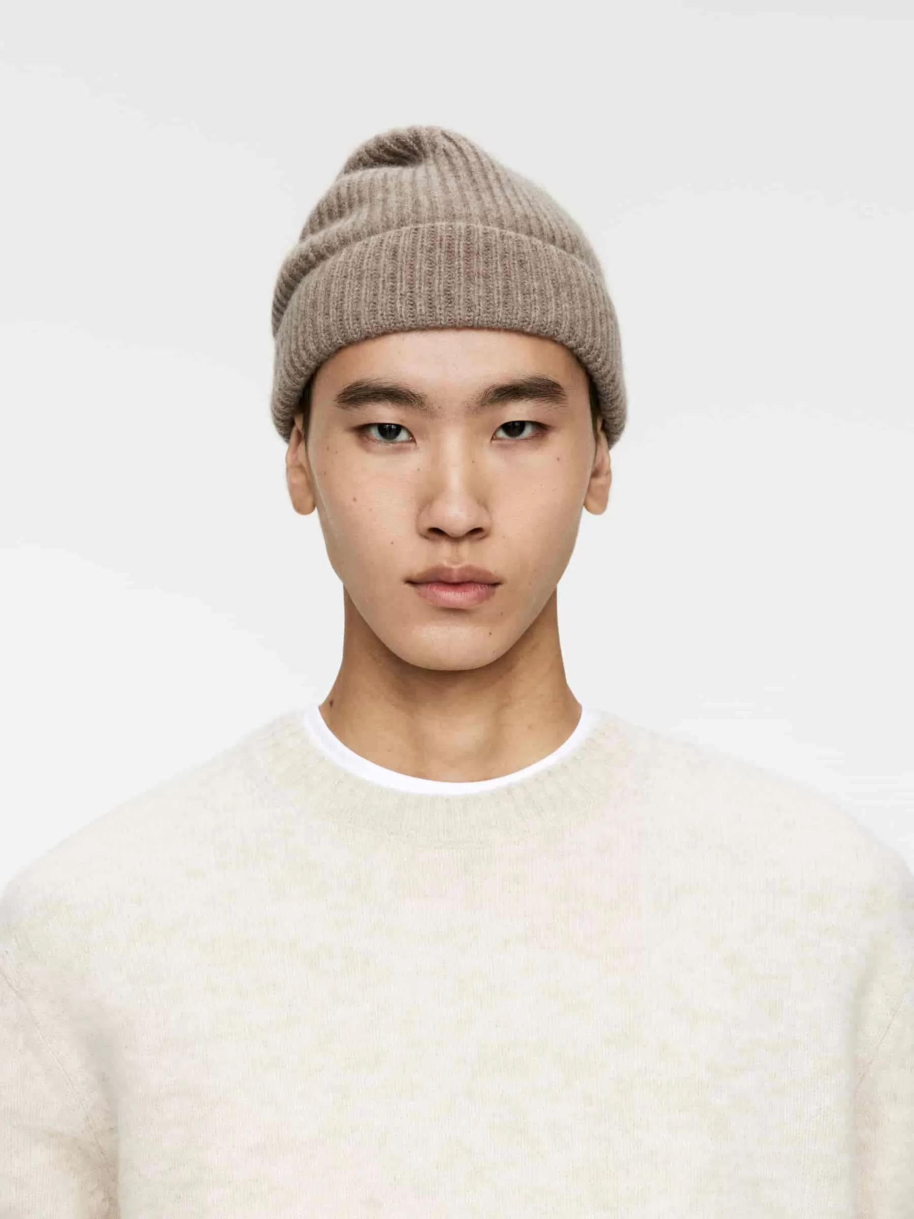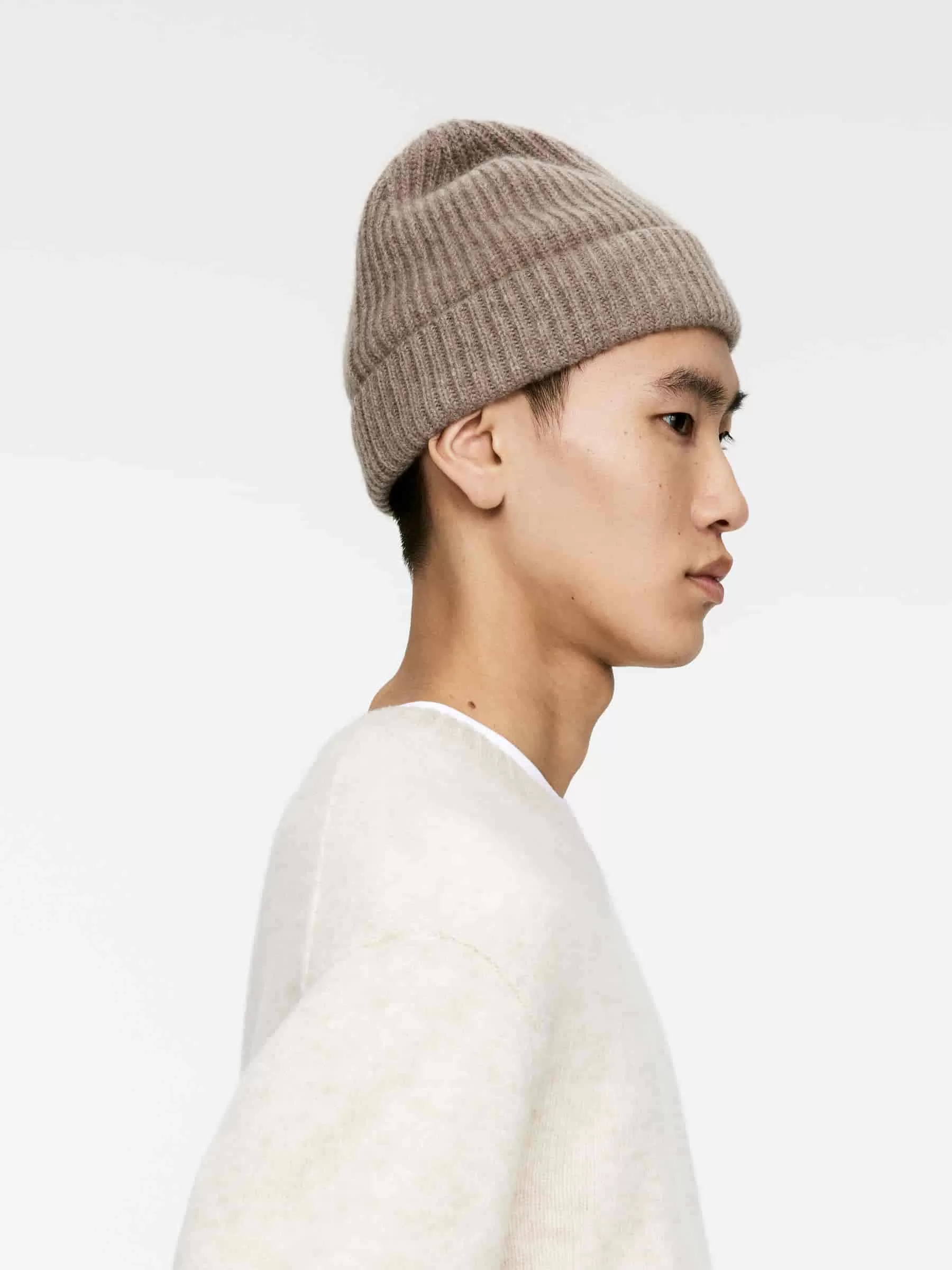 Mütze gestrickt im Vollstrickmuster aus einer weichen, wärmenden Mischung aus Kaschmir und Merinowolle. Mit einer Falte von 6 cm gestaltet.