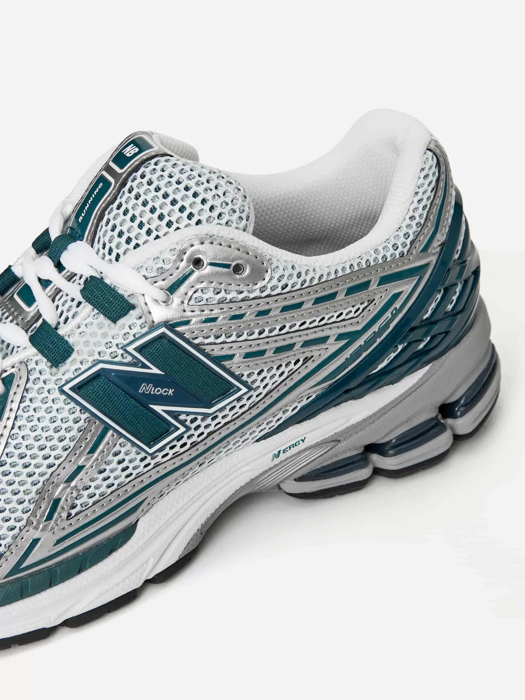 Der New Balance 1906R verfügt über eine Sohleneinheit mit einer Kombination aus flexibler ACTEVA LITE-Dämpfung, stoßdämpfendem N-ergy und segmentierten ABZORB SBS-Stollen an der Ferse. Das Obermaterial besteht aus offenmaschigem Mesh und einer Reihe geschwungener Synthetiküberzüge.