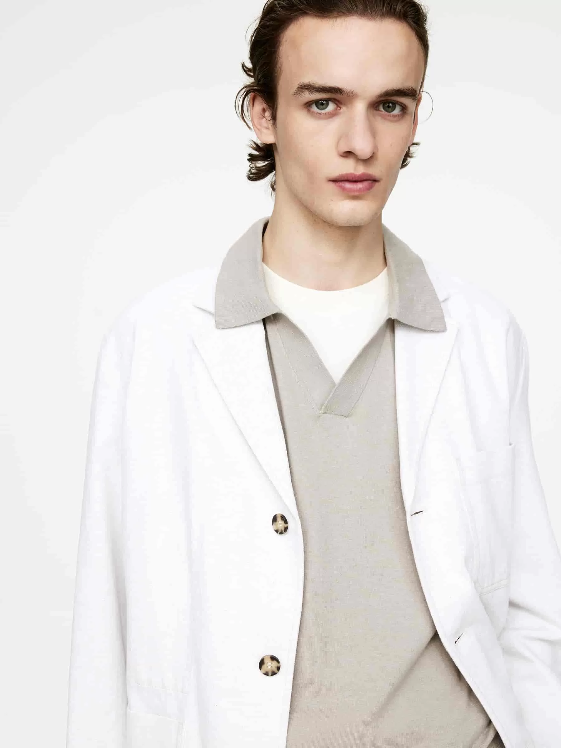 Die Mischung aus Leinen und Baumwolle verleiht diesem Feinstrick-Poloshirt einen weichen, kühlenden Tragekomfort. Ein lässiger Kurzarmstil mit Rippstrickkragen und V-Ausschnitt. Normale Passform.