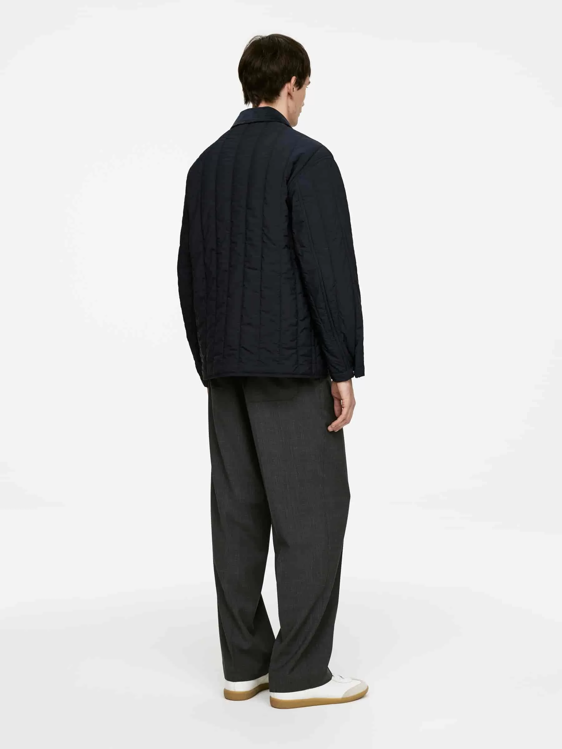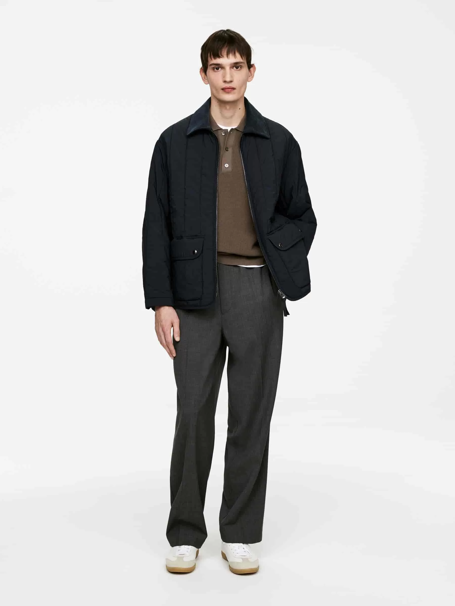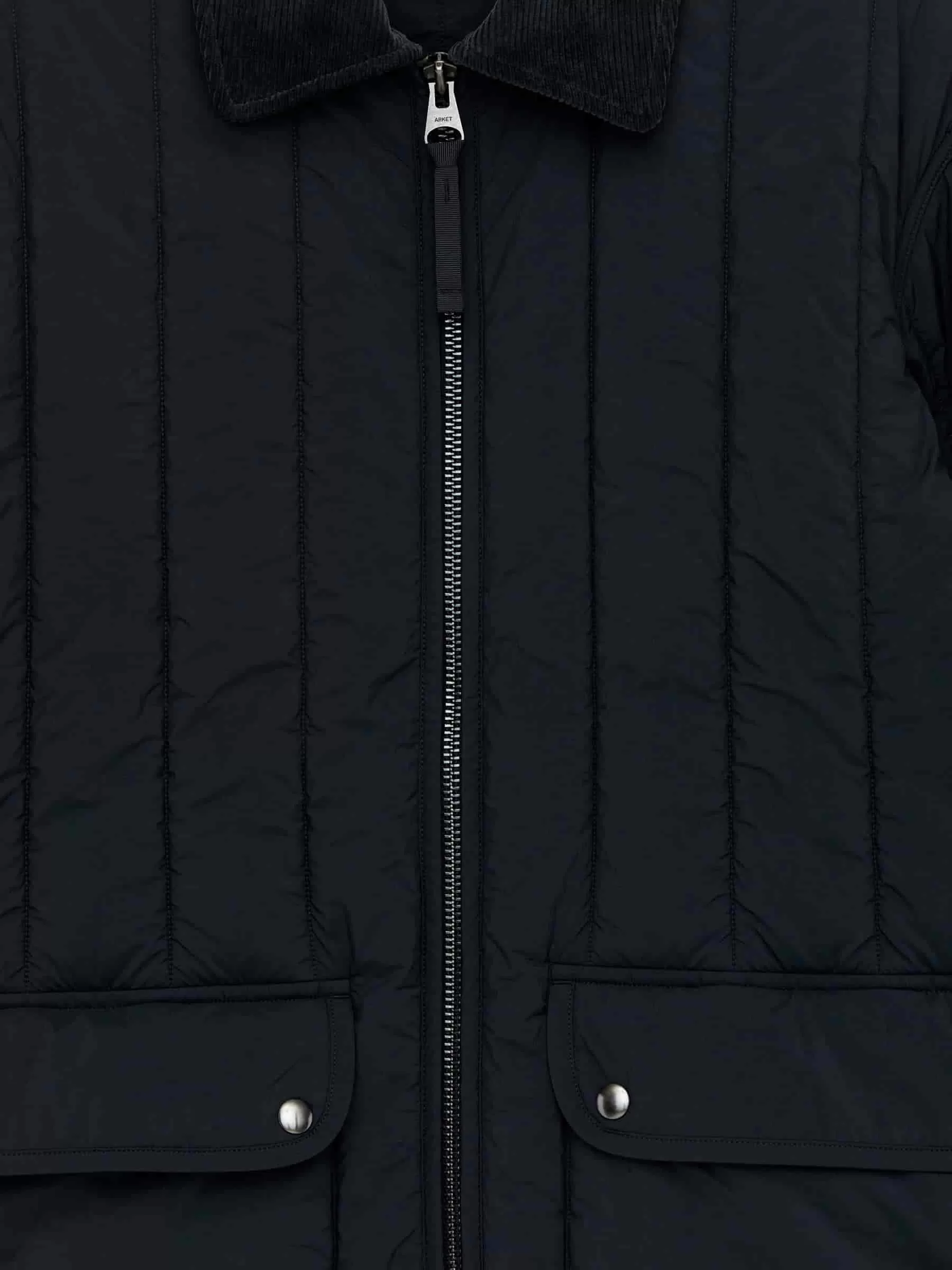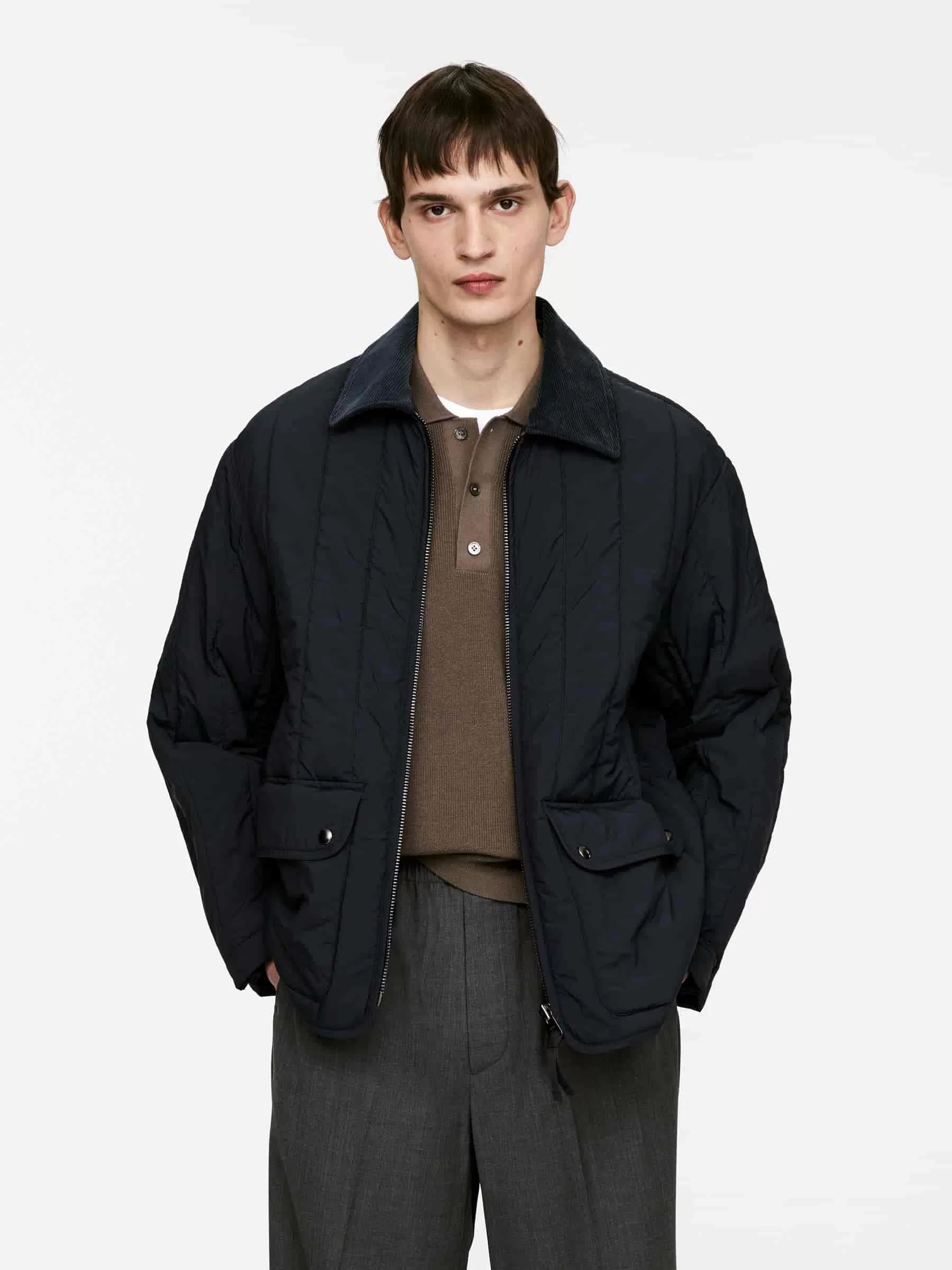 Gesteppte Innenjacke mit Cordkragen. Ein kurzes Modell mit Reißverschluss und aufgesetzten Taschen mit Klappe. Normale Passform.