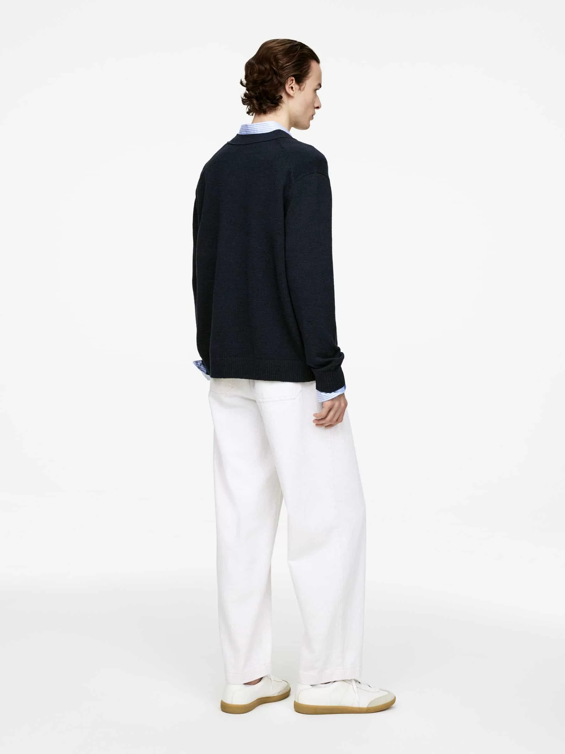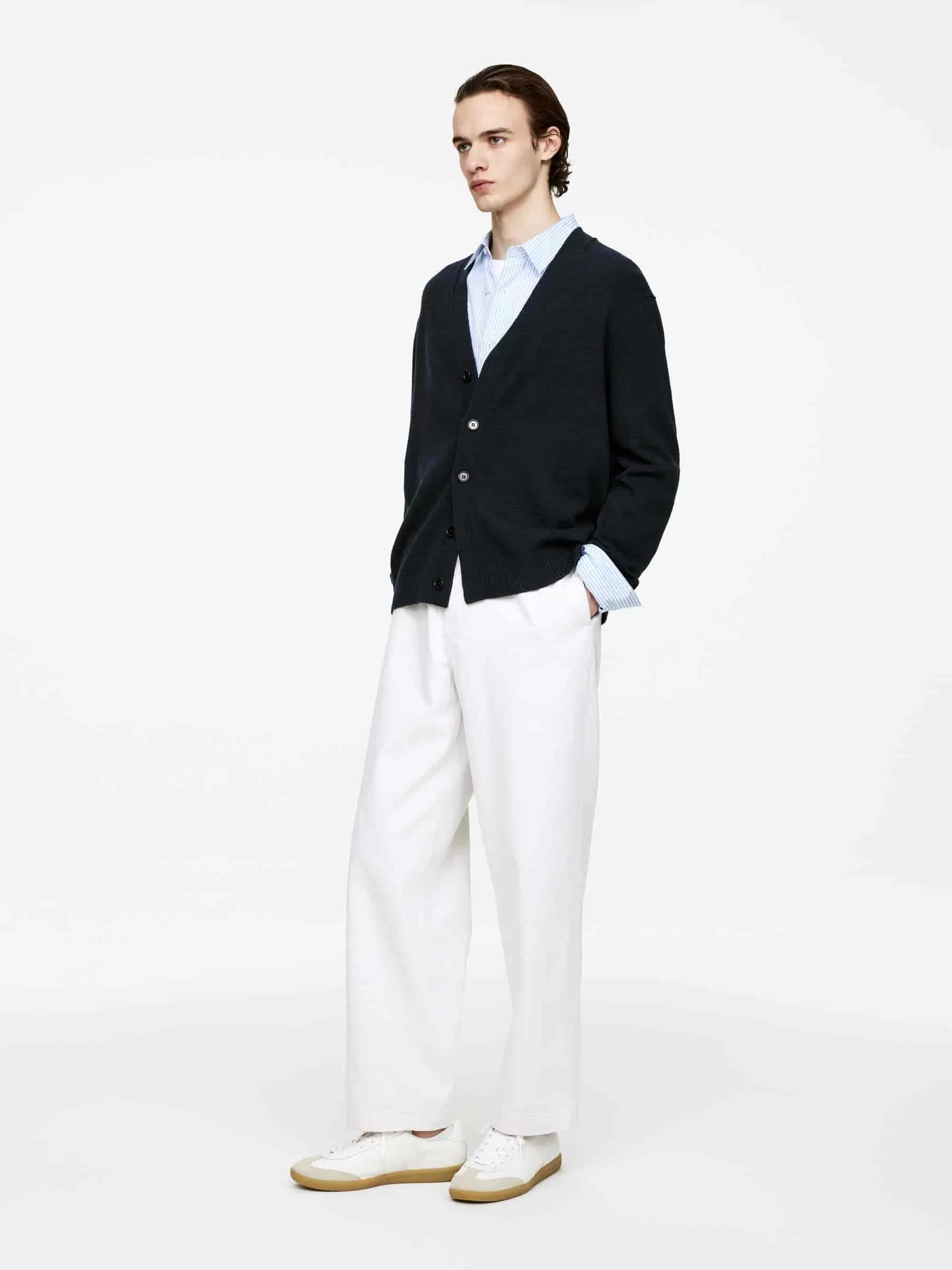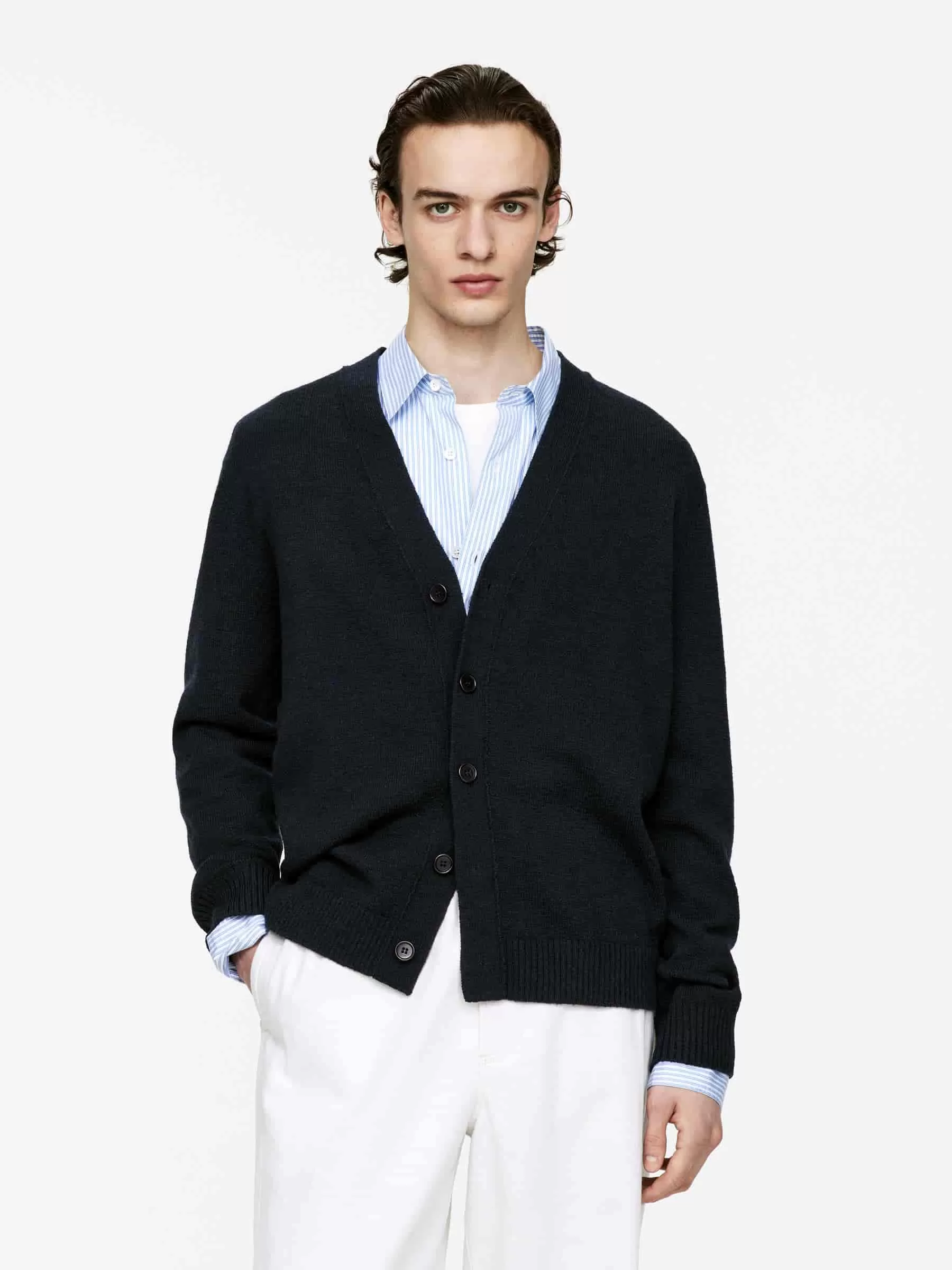 Cardigan mit V-Ausschnitt, gestrickt aus einer Mischung aus RWS-Wolle und Baumwolle. Detailliert mit Knöpfen vorne und gerippten Besätzen. Entspannte Passform. Das Produkt enthält 60 % RWS-Wolle (TE-00047206). Produkte, die nach dem Responsible Wool Standard (RWS) zertifiziert sind, enthalten Wollfasern von Farmen, die unabhängig nach Tierschutz- und Landbewirtschaftungsanforderungen zertifiziert sind.