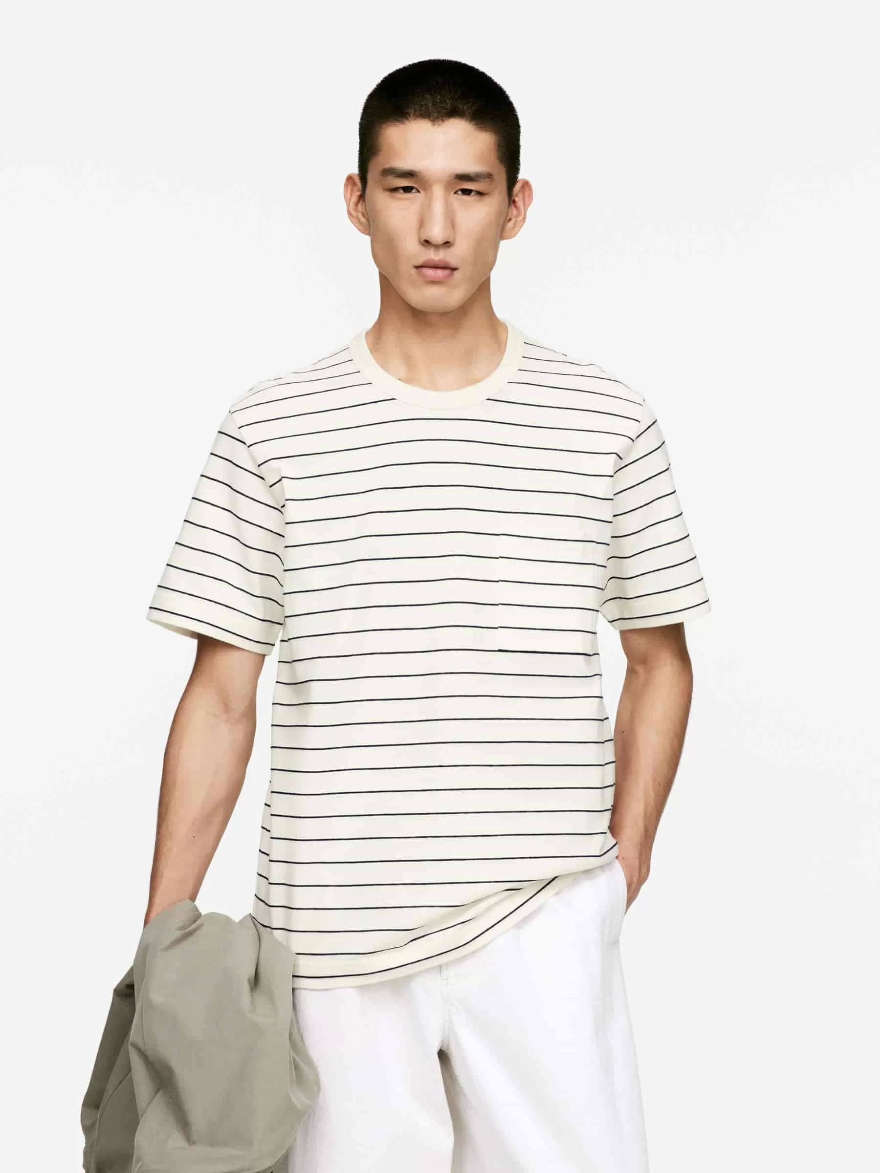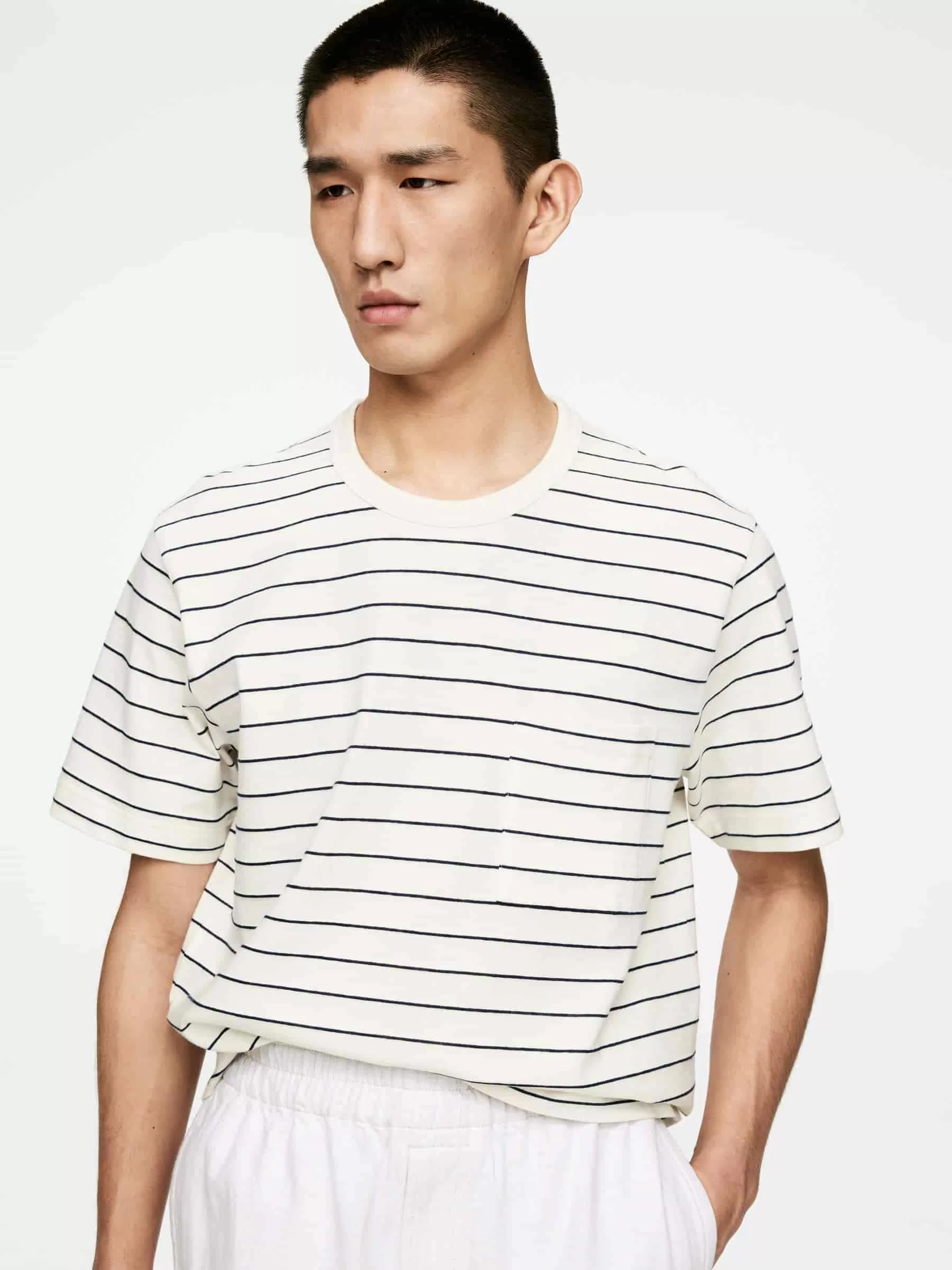 Kurzärmliges T-Shirt aus einer Baumwoll-Leinen-Mischung. Im regulären Schnitt geschnitten, mit Rundhalsausschnitt und Brusttasche.