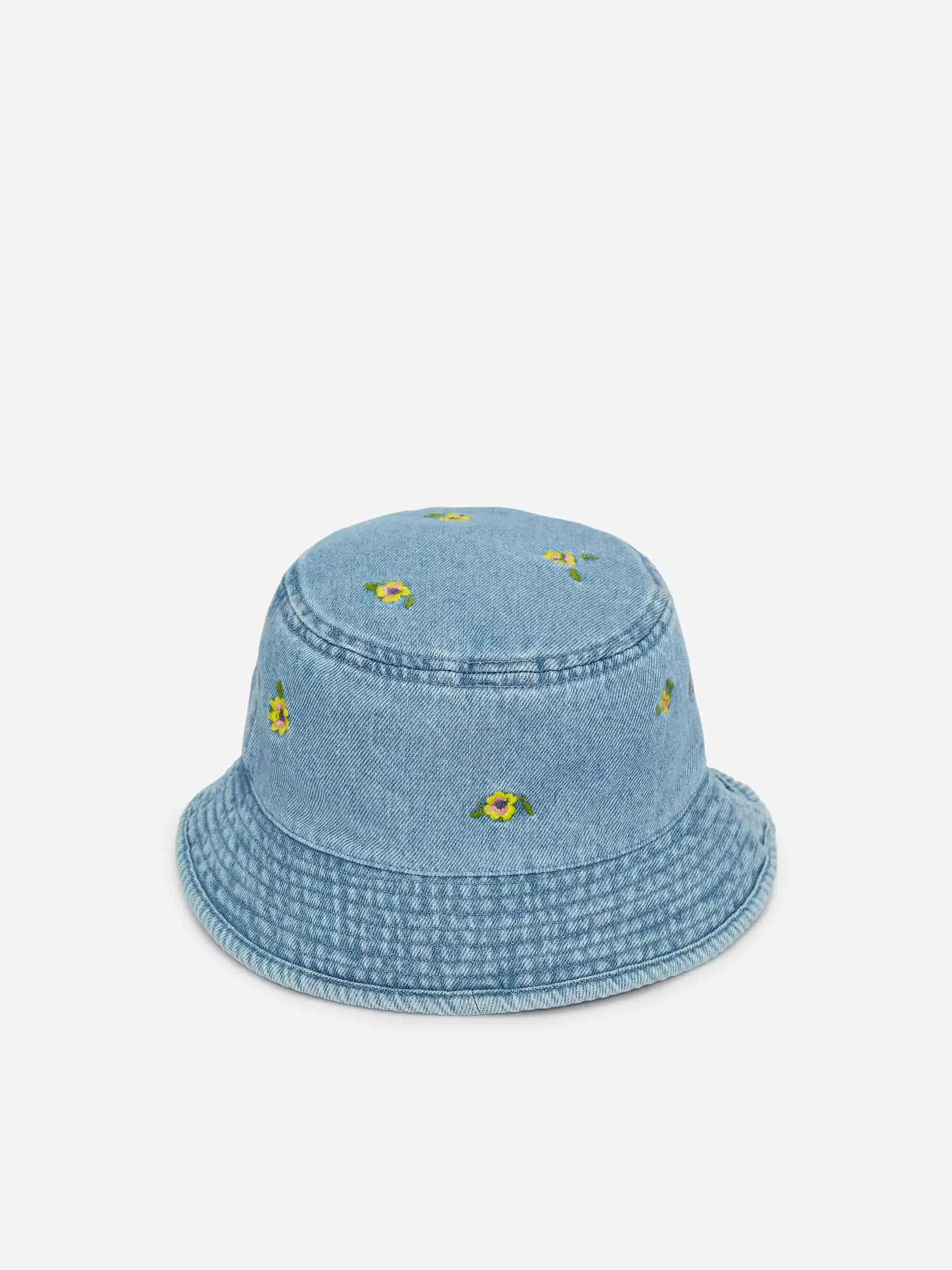 Denim-Fischerhut mit gestickten Details aus strapazierfähigem Baumwollgewebe. Mittellange Krempe, die Schutz vor der Sonne bietet.