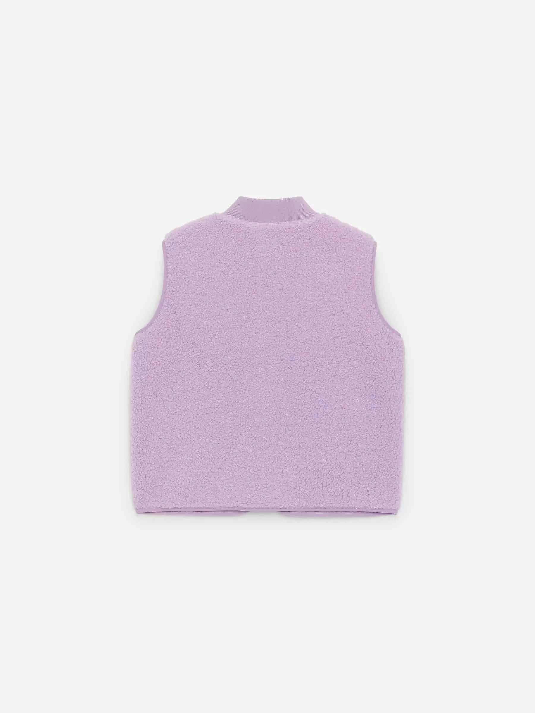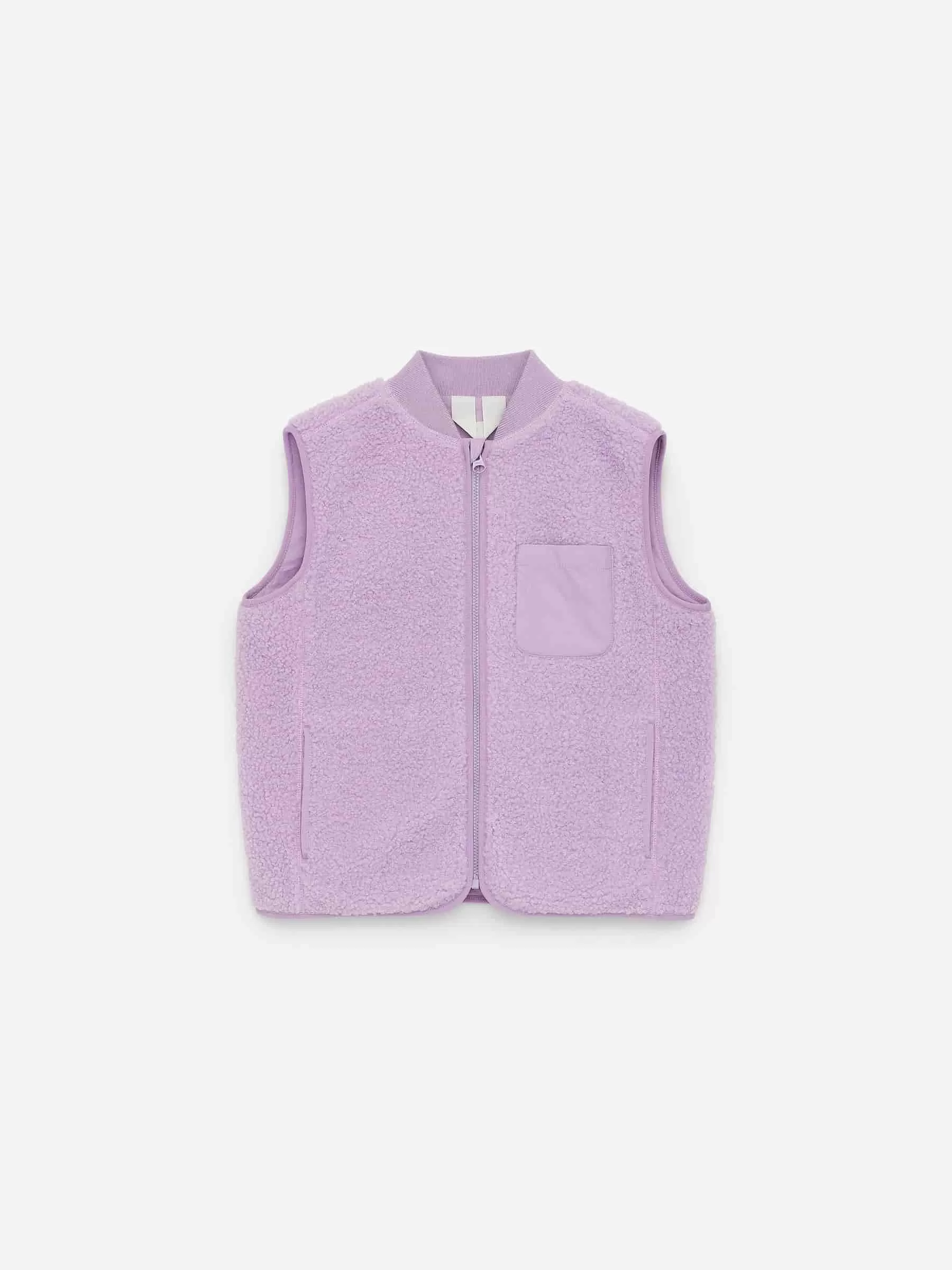 Weste aus weichem Florstoff. Aufgesetzte Signel-Tasche auf der Brust und Leistentaschen an den Seiten. Reißverschluss und Rippstrick am Hals.