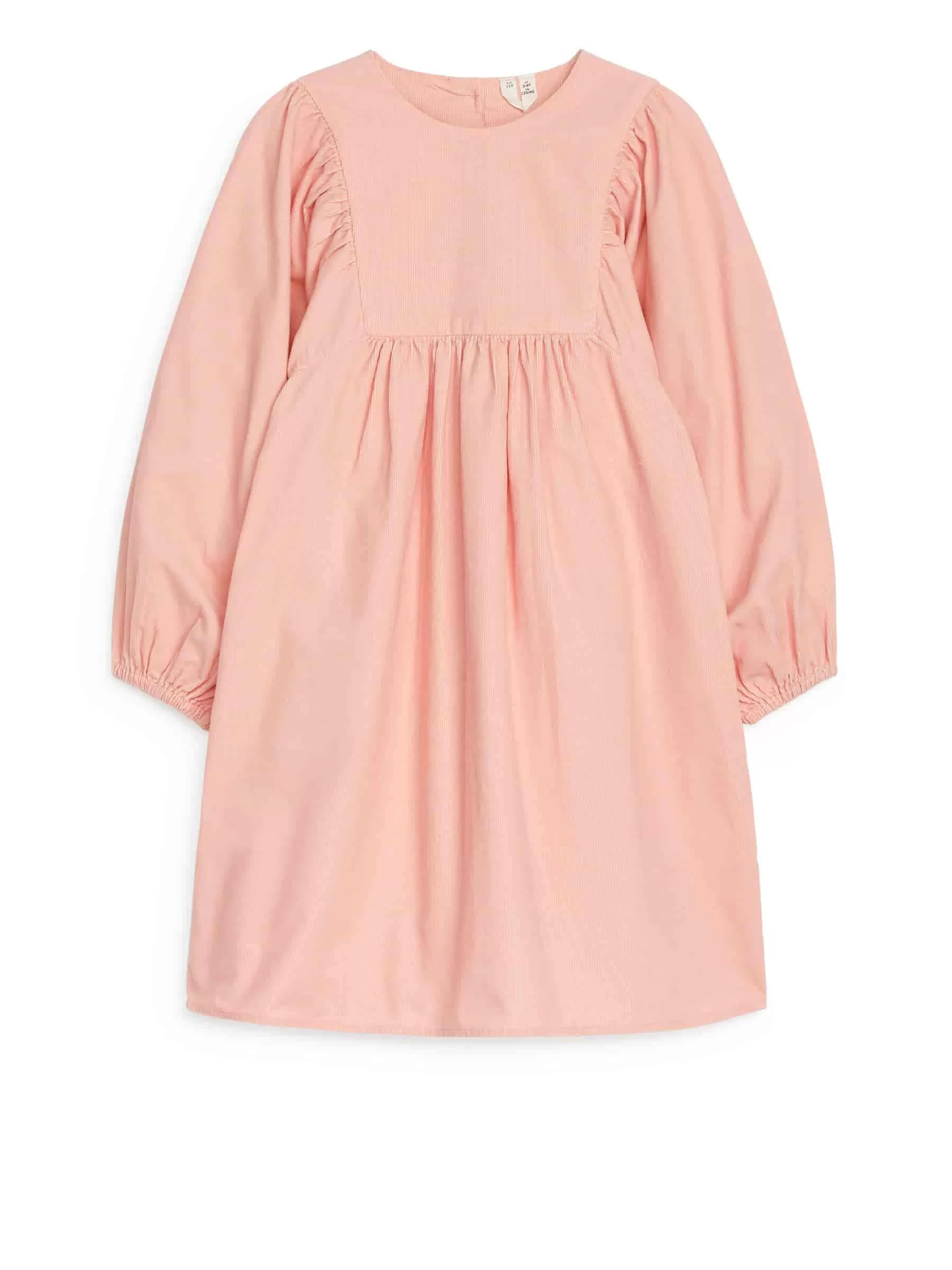 Langärmliges Baumwollkleid mit Raffungen und Knopfverschluss hinten. Gummizüge an den Ärmelrändern.