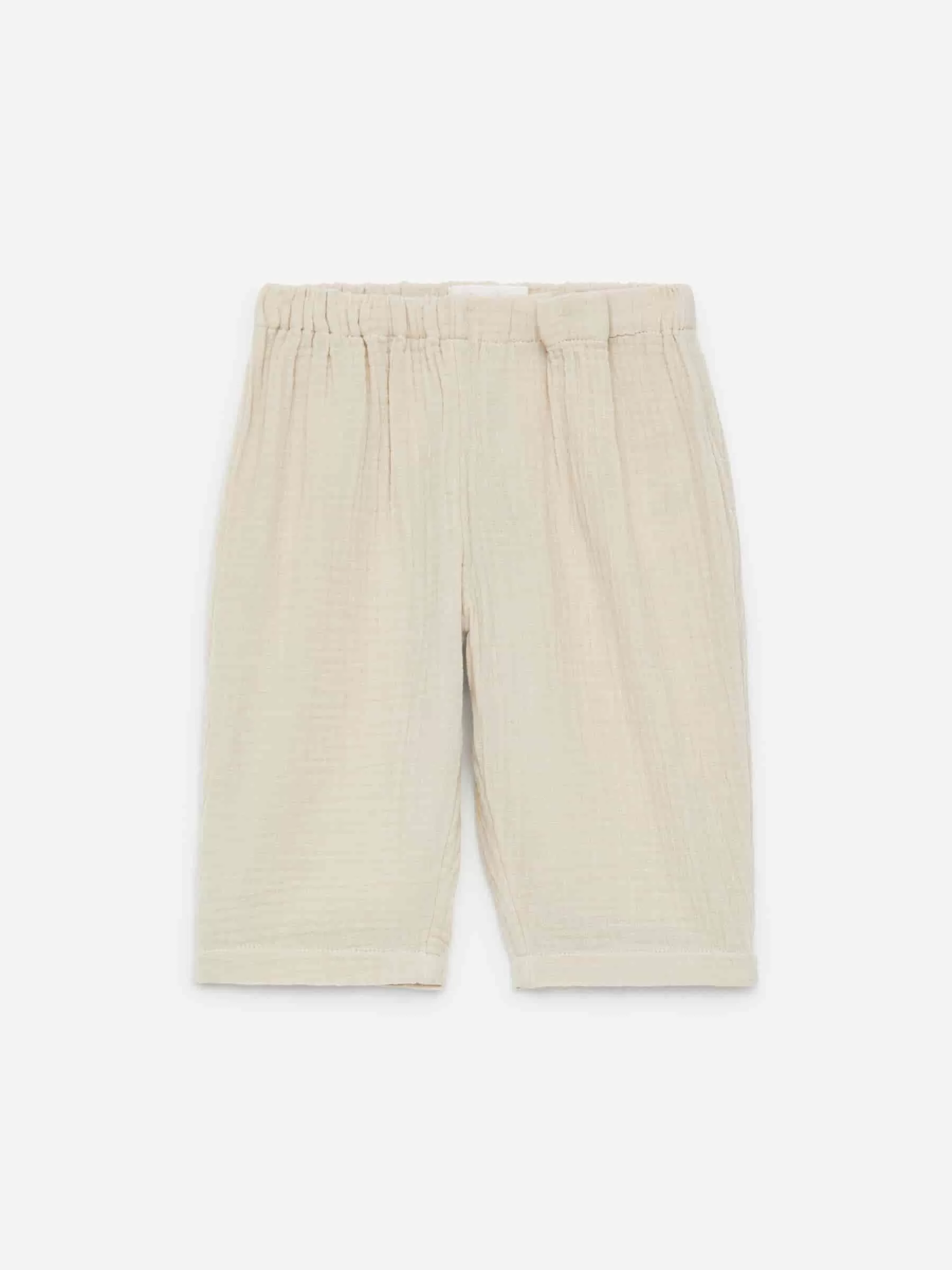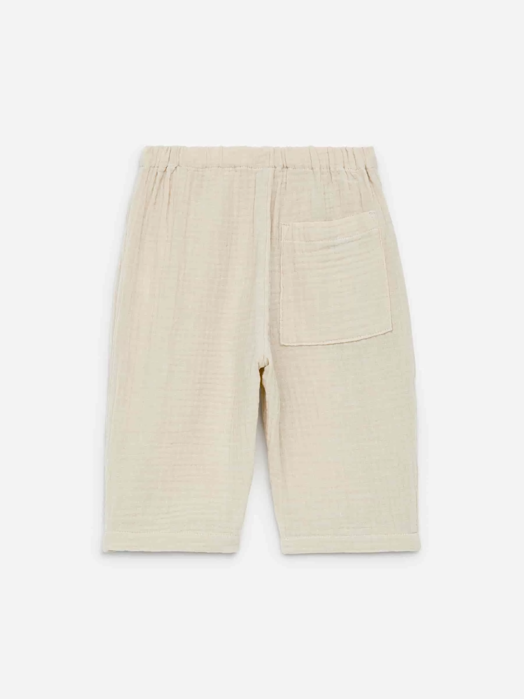 Locker geschnittene Hose aus weichem Musselingewebe aus Baumwolle. Ausgestattet mit einem verstellbaren Bund und einer einzelnen Gesäßtasche.