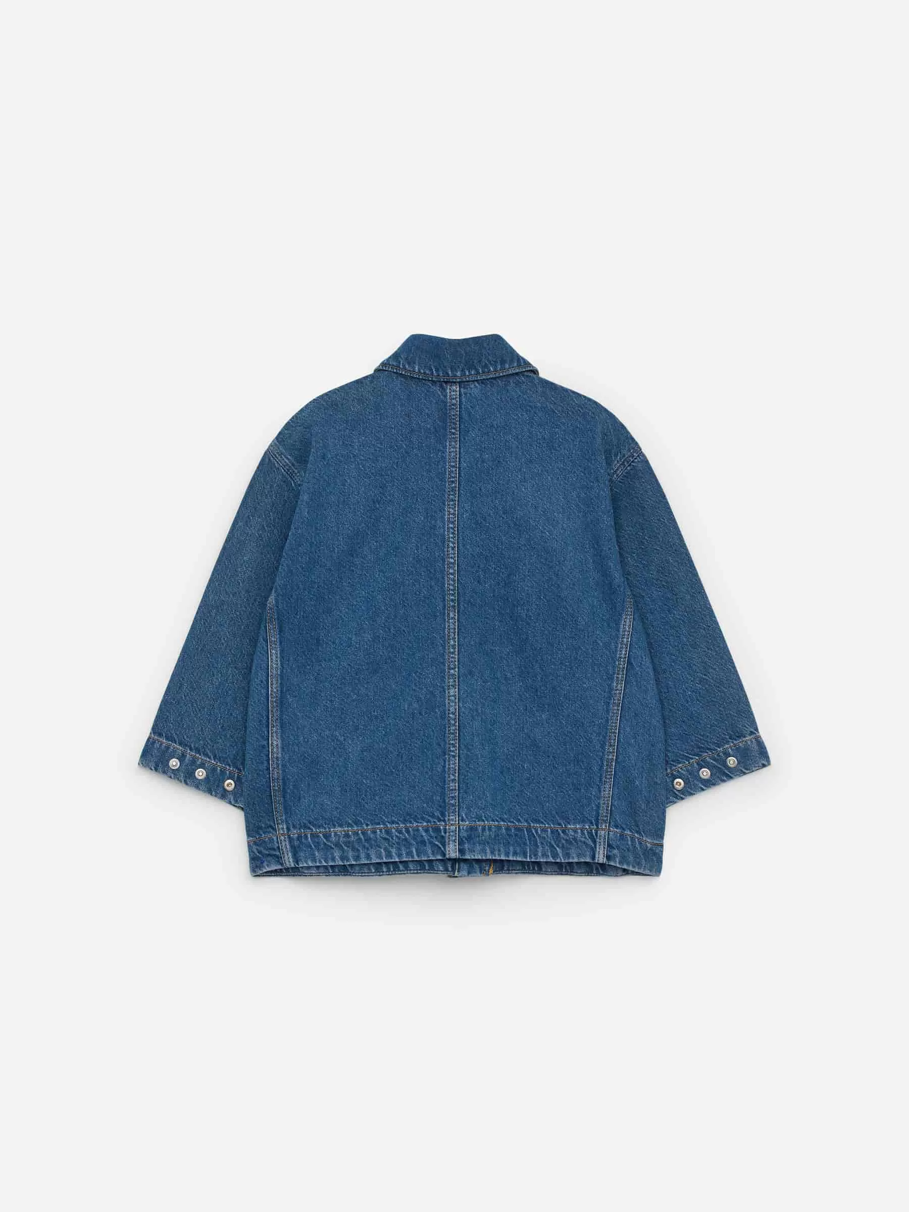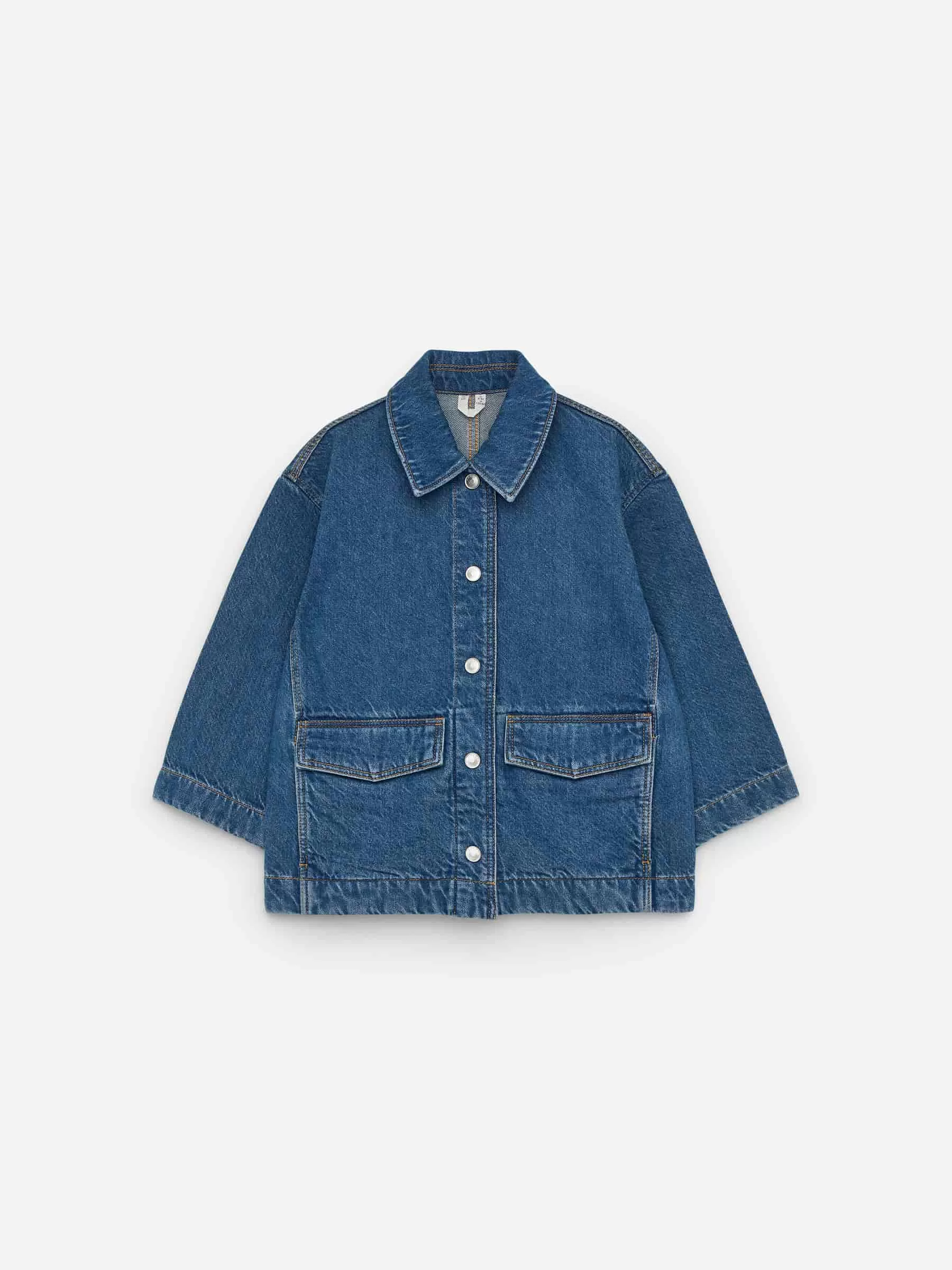 Jeans-Overshirt mit überschnittenen Schultern, Vordertaschen und geknöpfter Vorderseite.