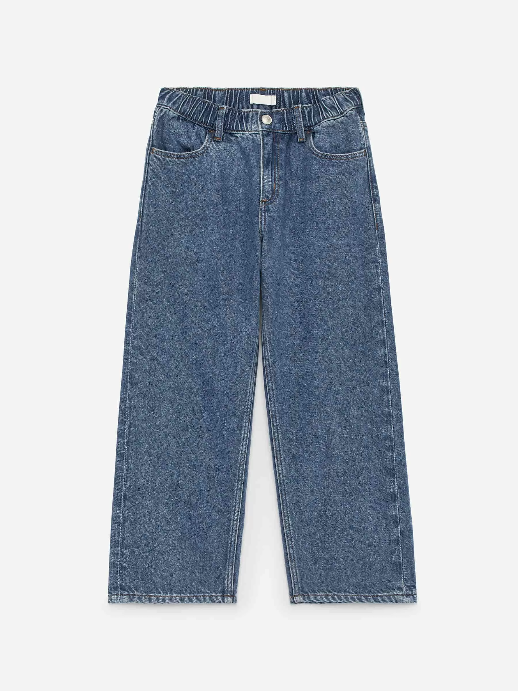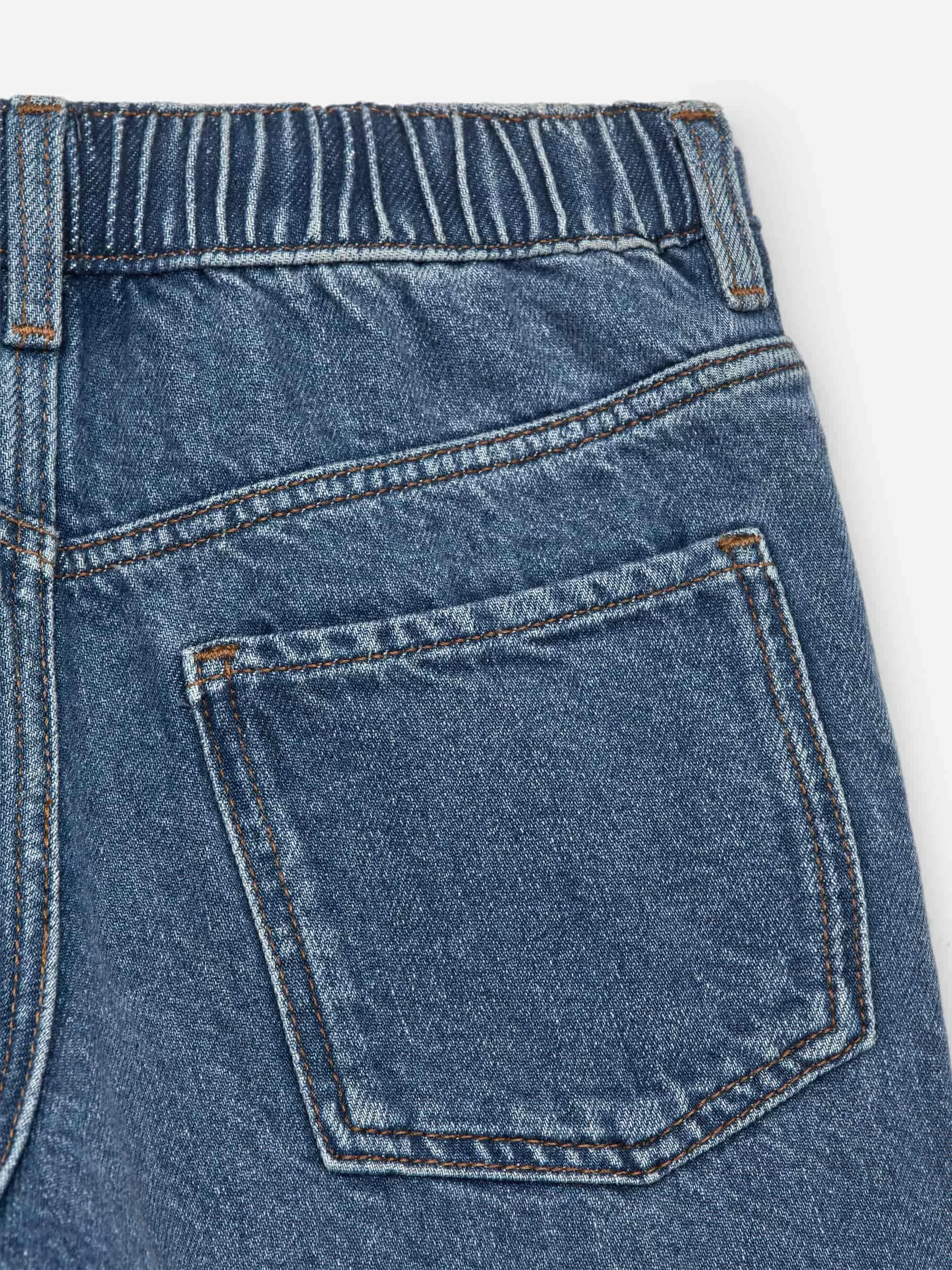 Jeanshose zum Hineinschlüpfen mit verstellbarem Gummizug in der Taille. Detailliert mit Druckknopfverschluss und Metallreißverschluss sowie Vorder- und Gesäßtaschen. Lockere Passform.