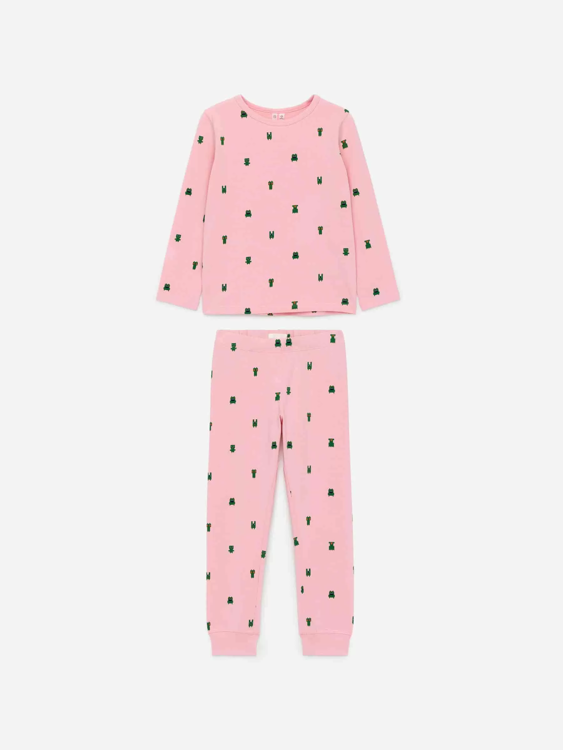 Dieser zweiteilige Pyjama ist aus einem weichen Single-Jersey-Stoff genäht und besteht aus Baumwolle. Ein Pyjama-Oberteil mit Rundhalsausschnitt, langen Ärmeln und einer Hose mit elastischem Bund. Gerippte Bündchen an beiden Ärmeln und Beinen.