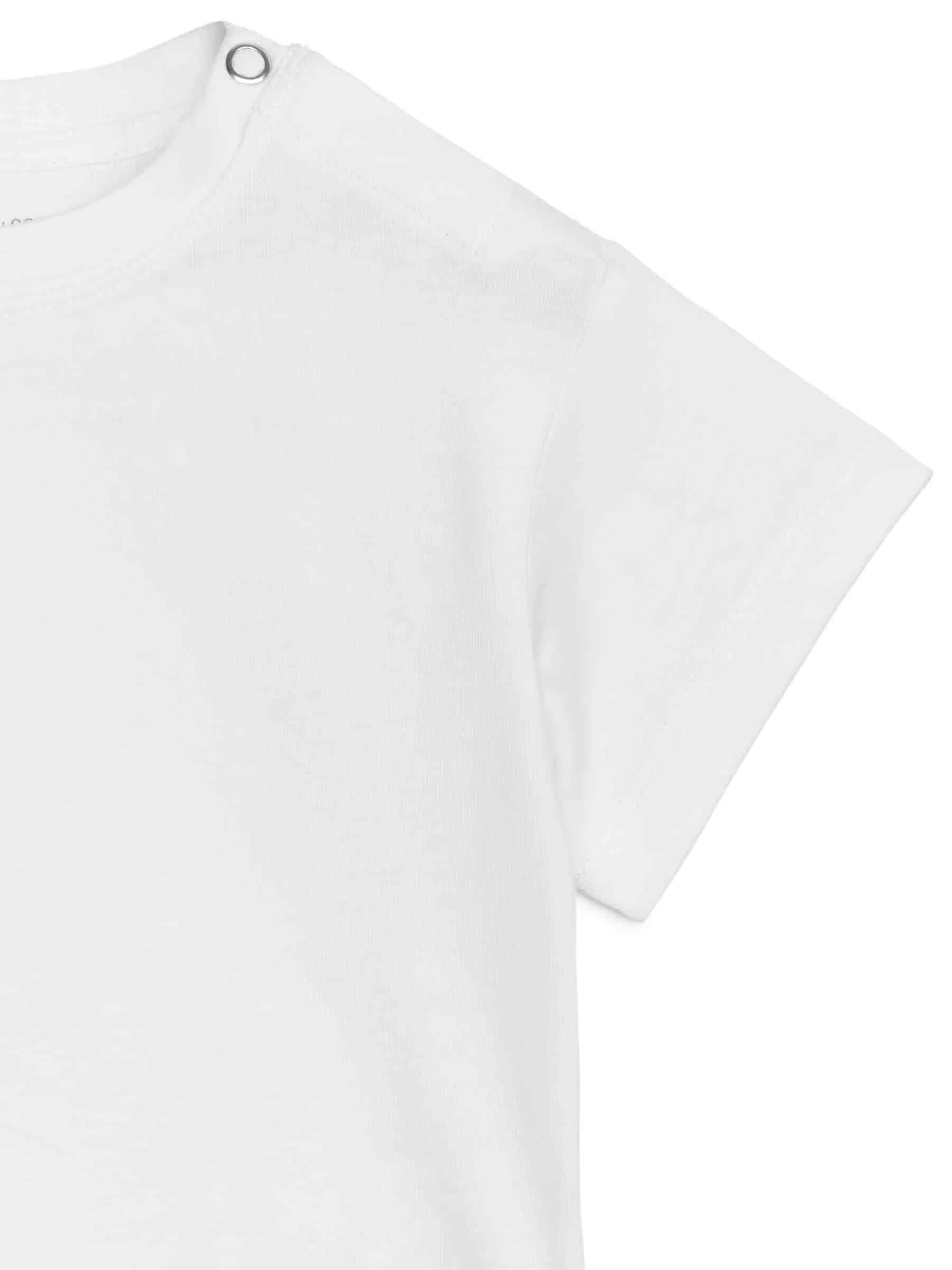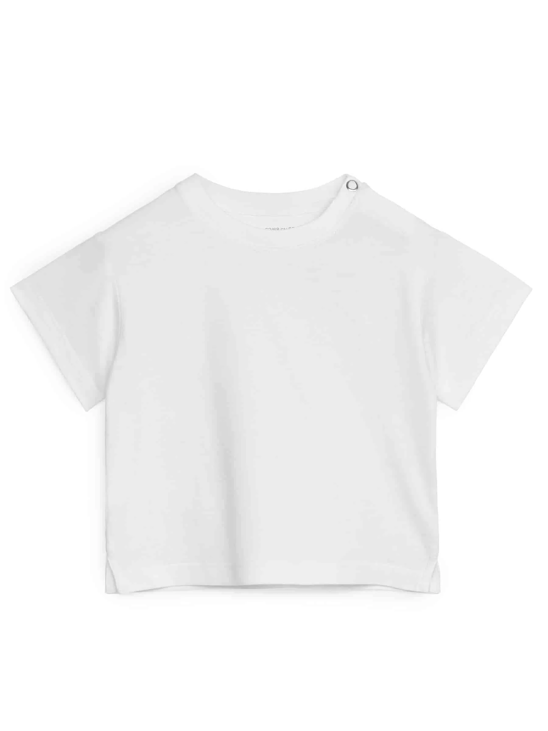 Kurzärmliges T-Shirt aus weichem Single-Jersey aus Baumwolle. Locker geschnitten mit leicht überschnittenen Schultern. Druckknopfverschluss an der linken Schulter erleichtert das Anziehen. Schlitze an den Seitennähten.
