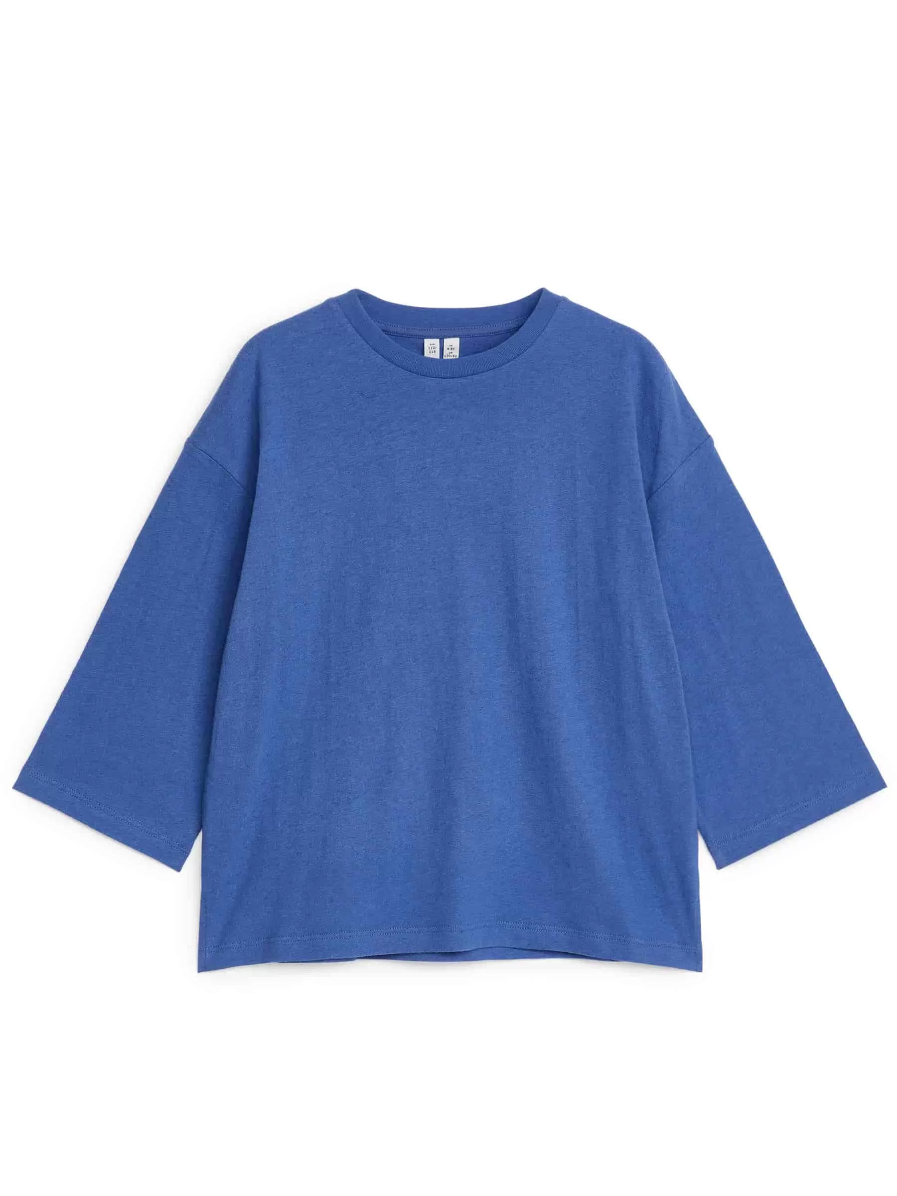 Langärmliges T-Shirt aus Baumwoll-Leinen-Jersey. Mit überschnittenen Schultern und einer weiten Silhouette.