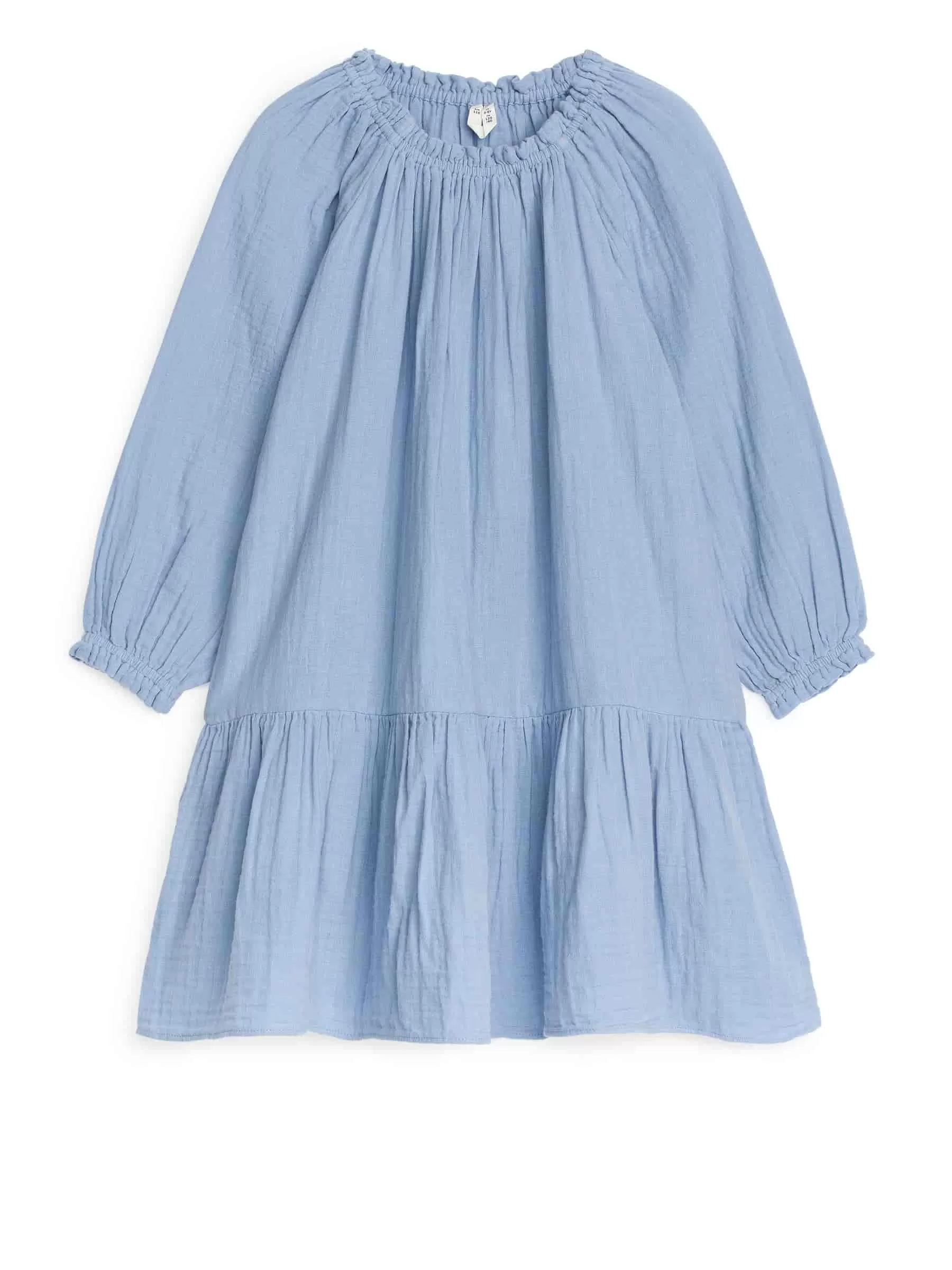 Musselinkleid mit Rüschendetails und Gummizügen am Ausschnitt und an den Manschetten. Raffungen an Taille und Raglan, 3/4-Ärmel.