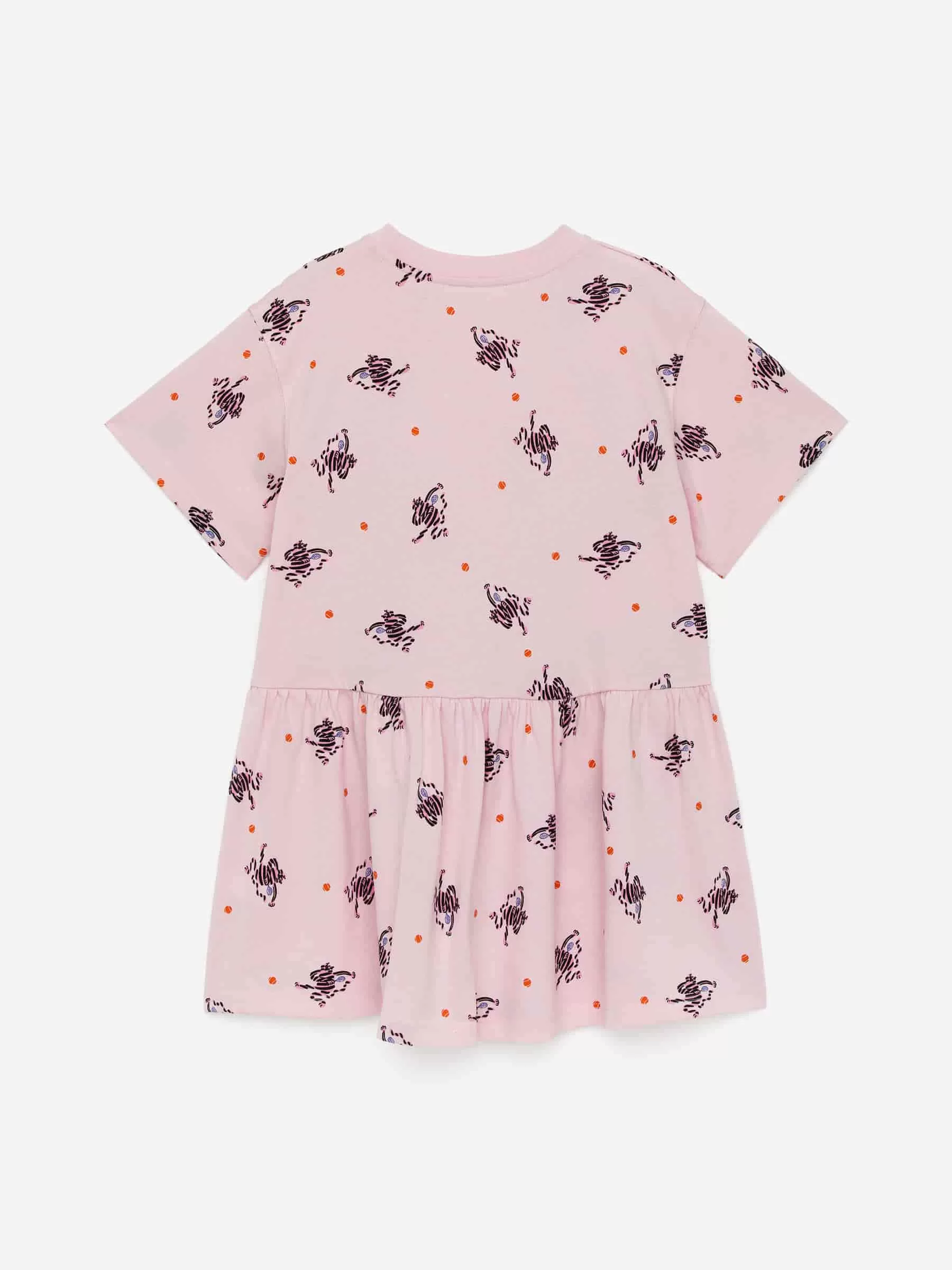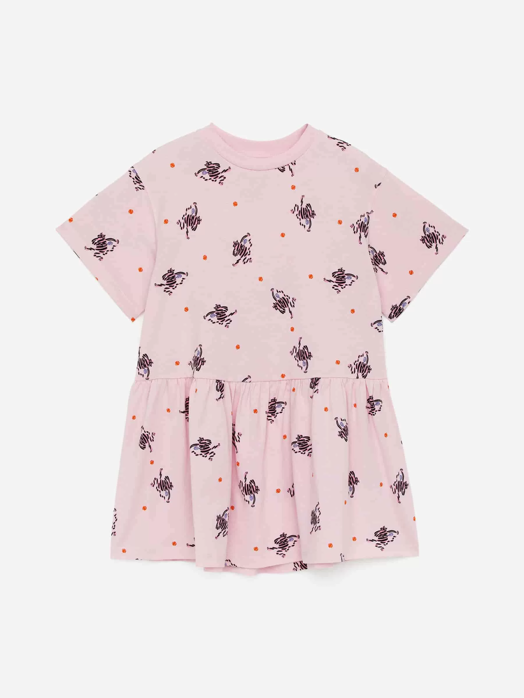 Kurzärmliges Rüschenkleid aus weichem Baumwolljersey. Für eine entspannte Passform geschnitten, mit geripptem Saum am Ausschnitt und Raffungen an der Taille.