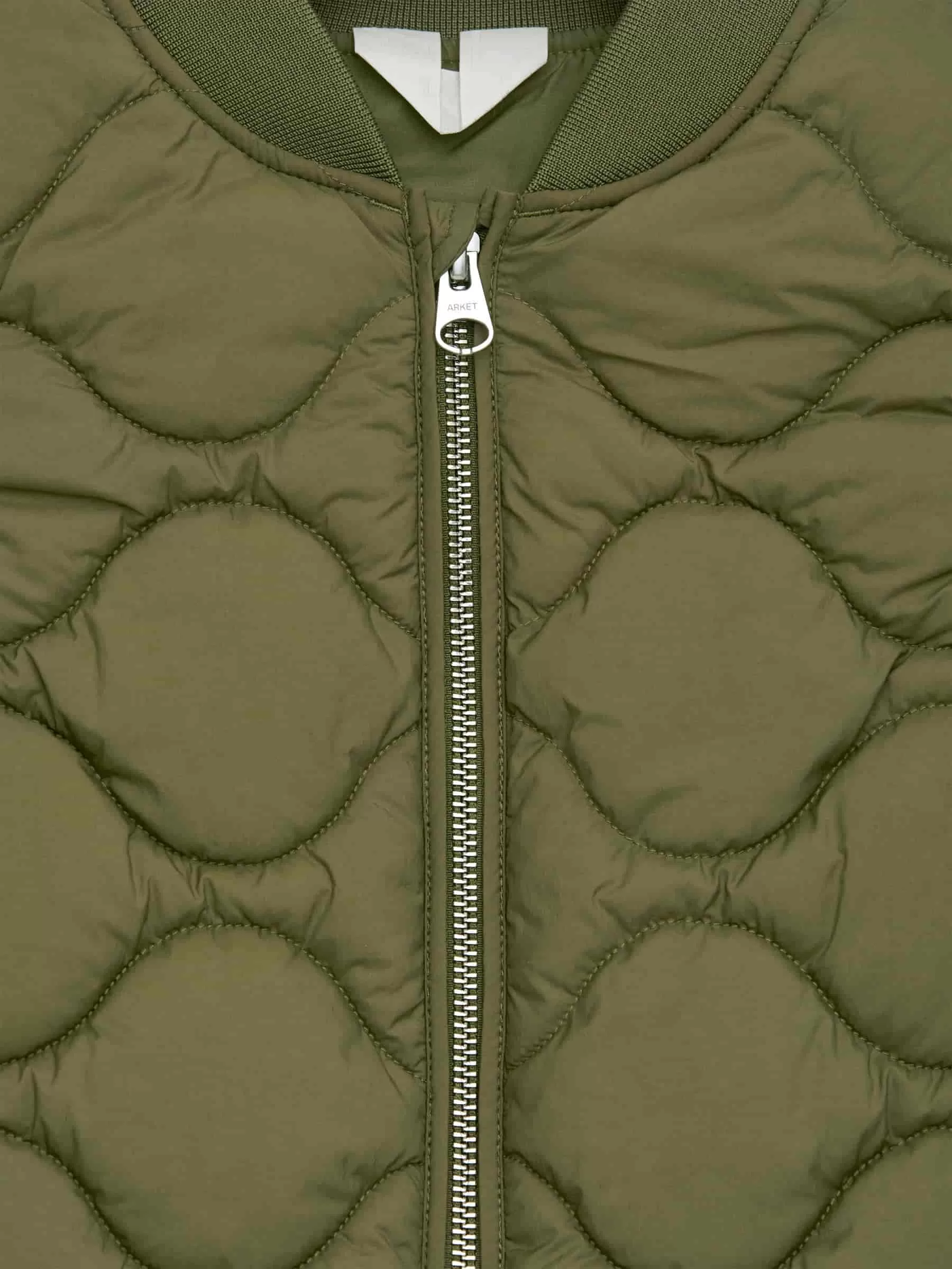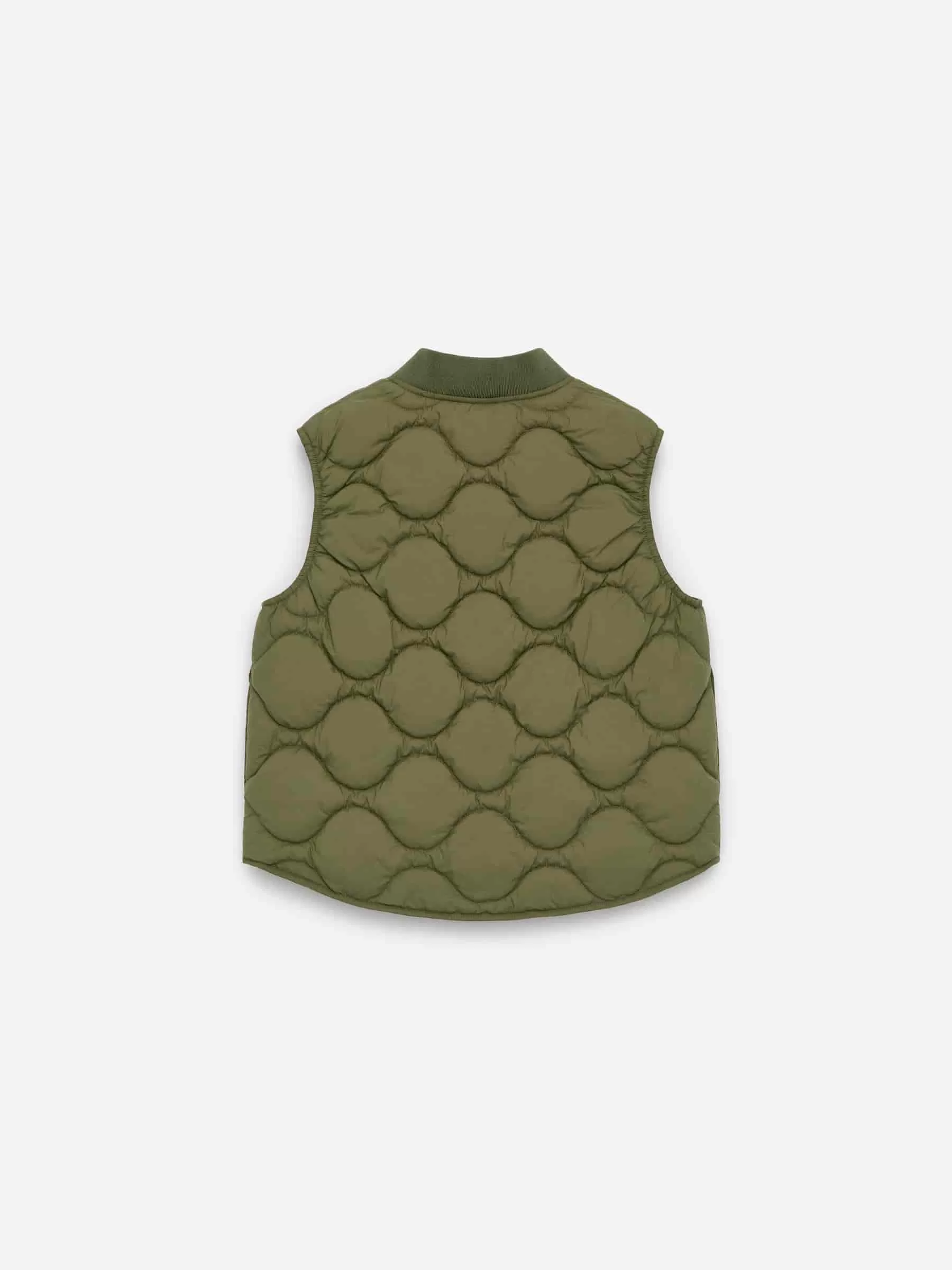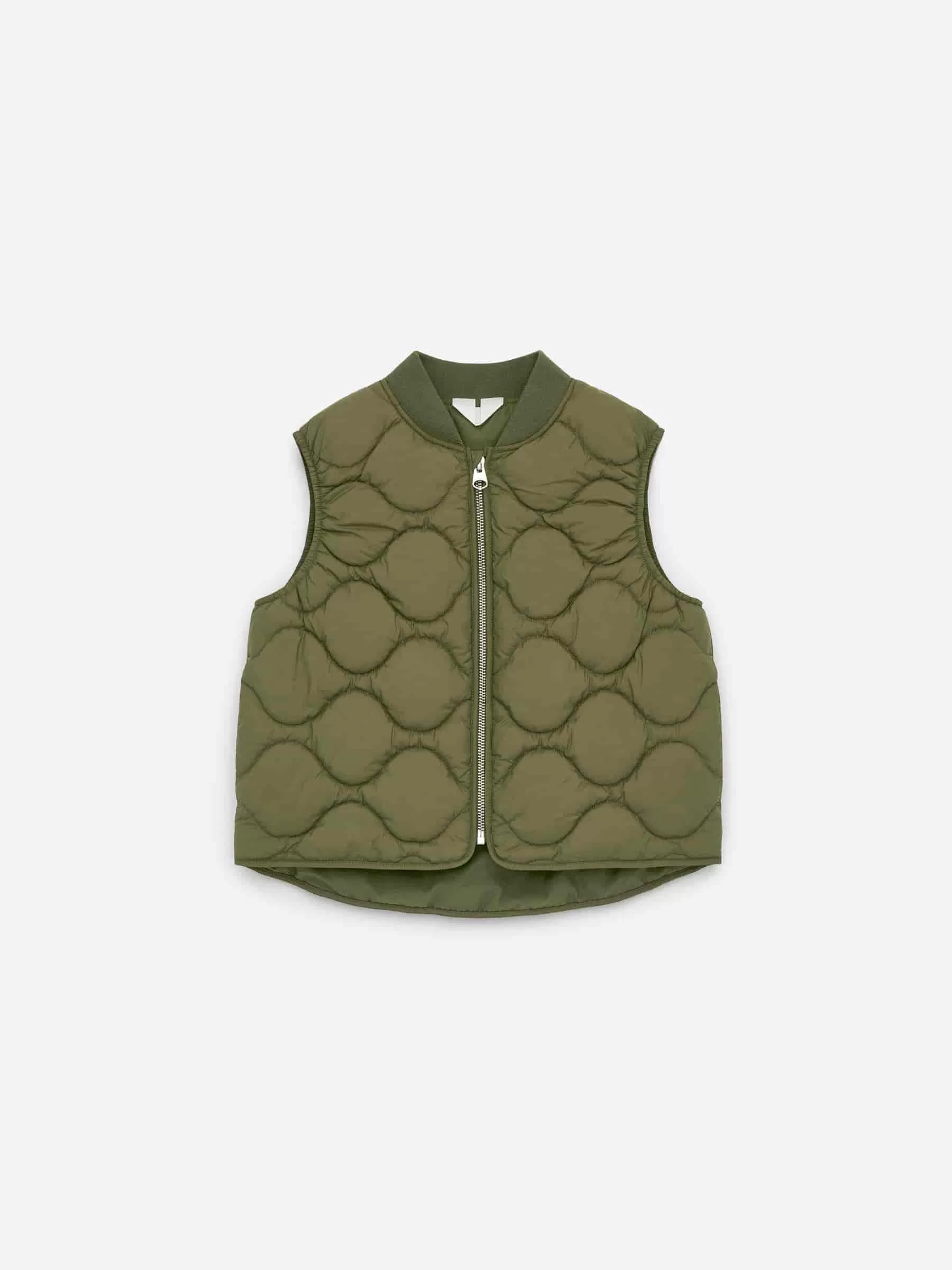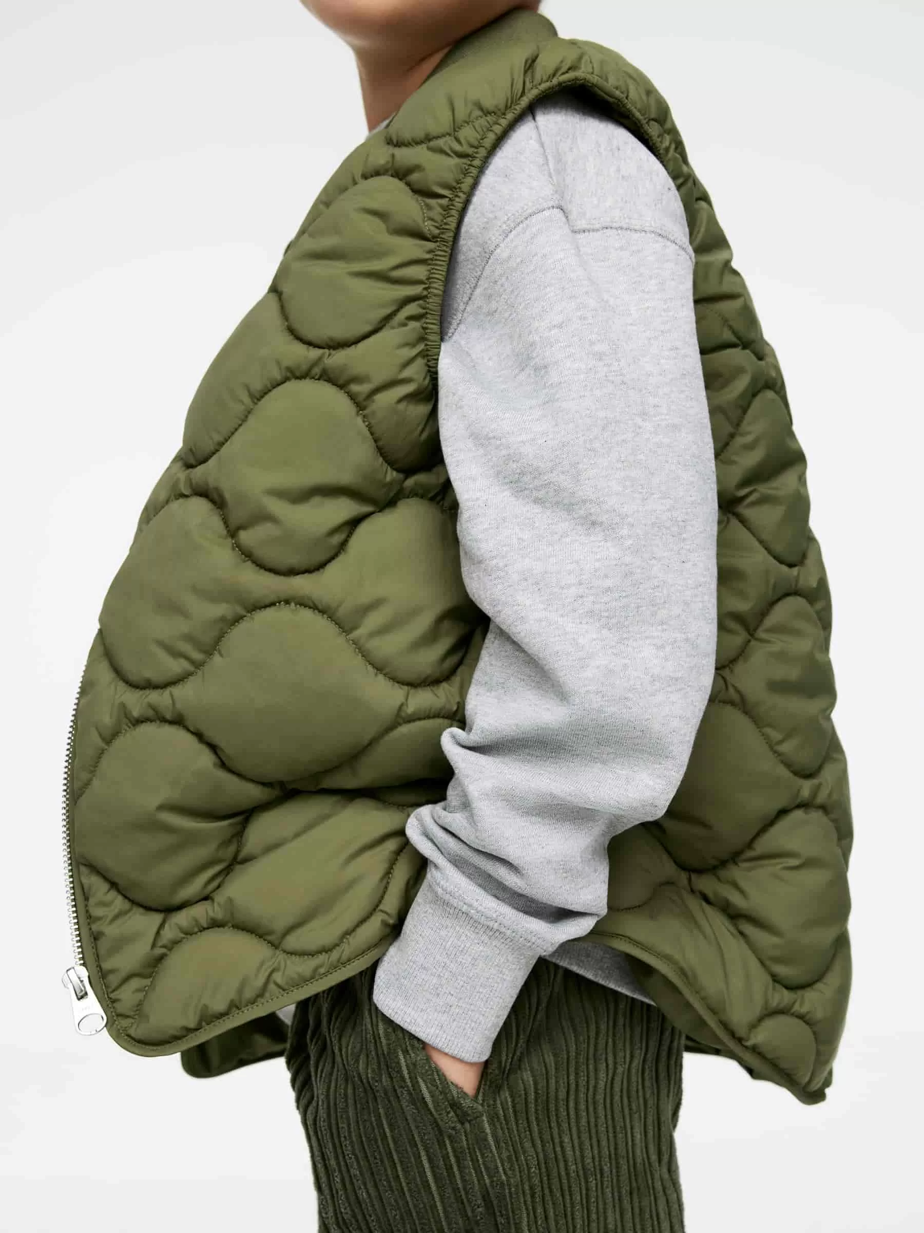 Gepolsterte Weste mit gesteppter Oberfläche. Ausgestattet mit einem Metallreißverschluss vorne und seitlichen Nahttaschen. Geschwungener Saum.