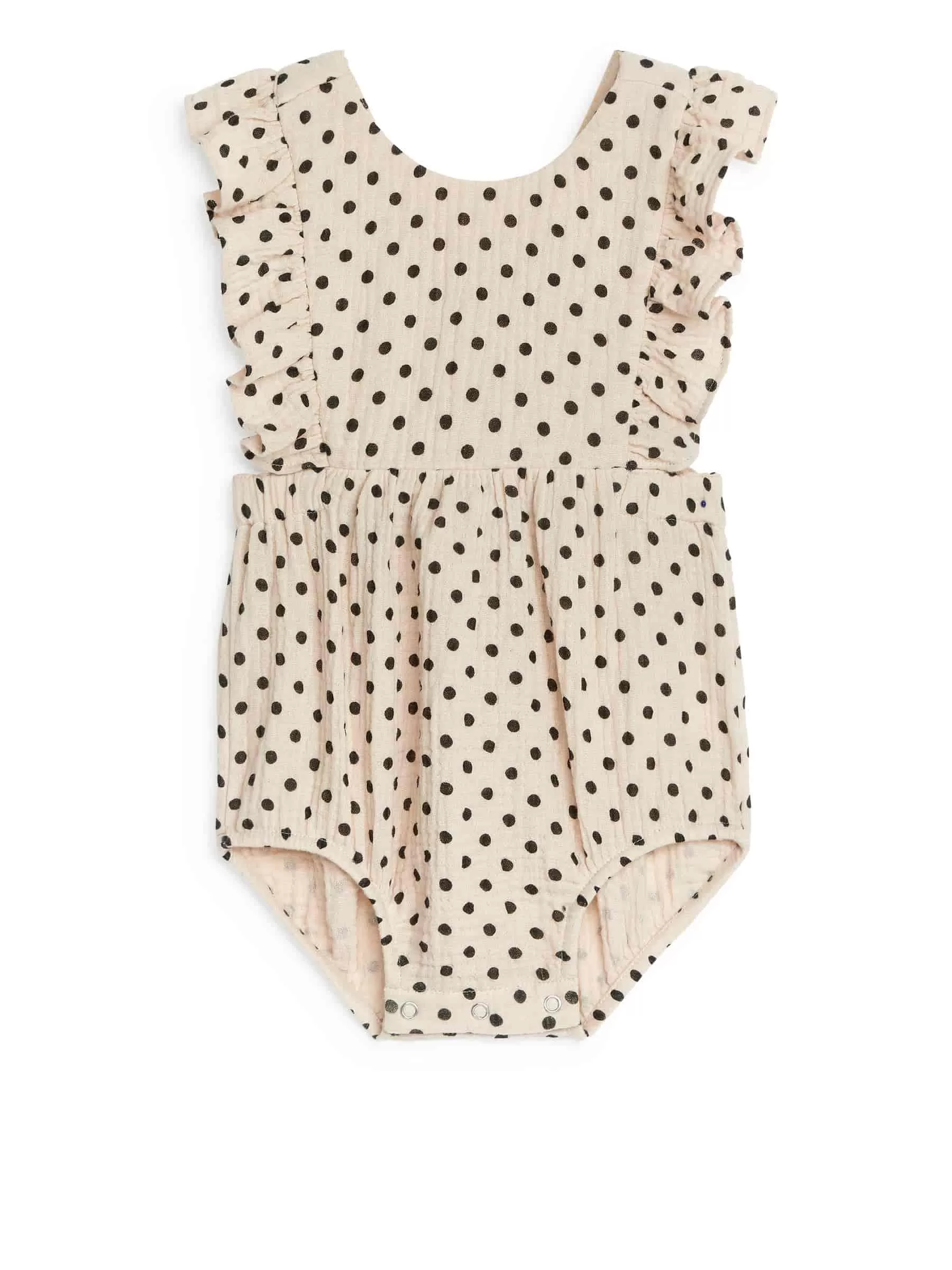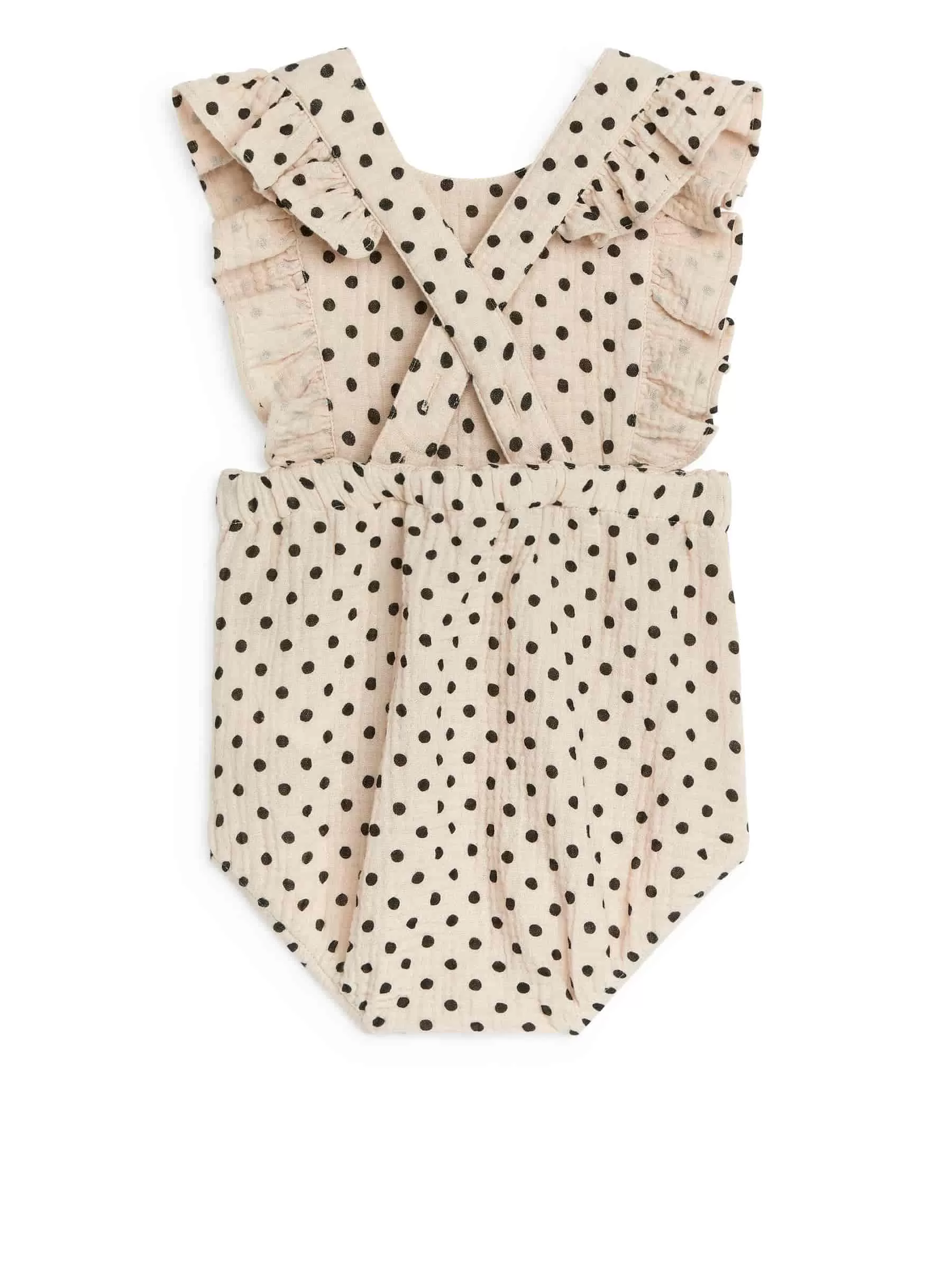 Ärmelloser Strampler aus weichem Baumwoll-Musselin. Rüschen an den Seiten und gekreuzte, verstellbare Träger hinten. Gummizug an der Beinöffnung und Druckknöpfe im Schritt. Normale Passform.