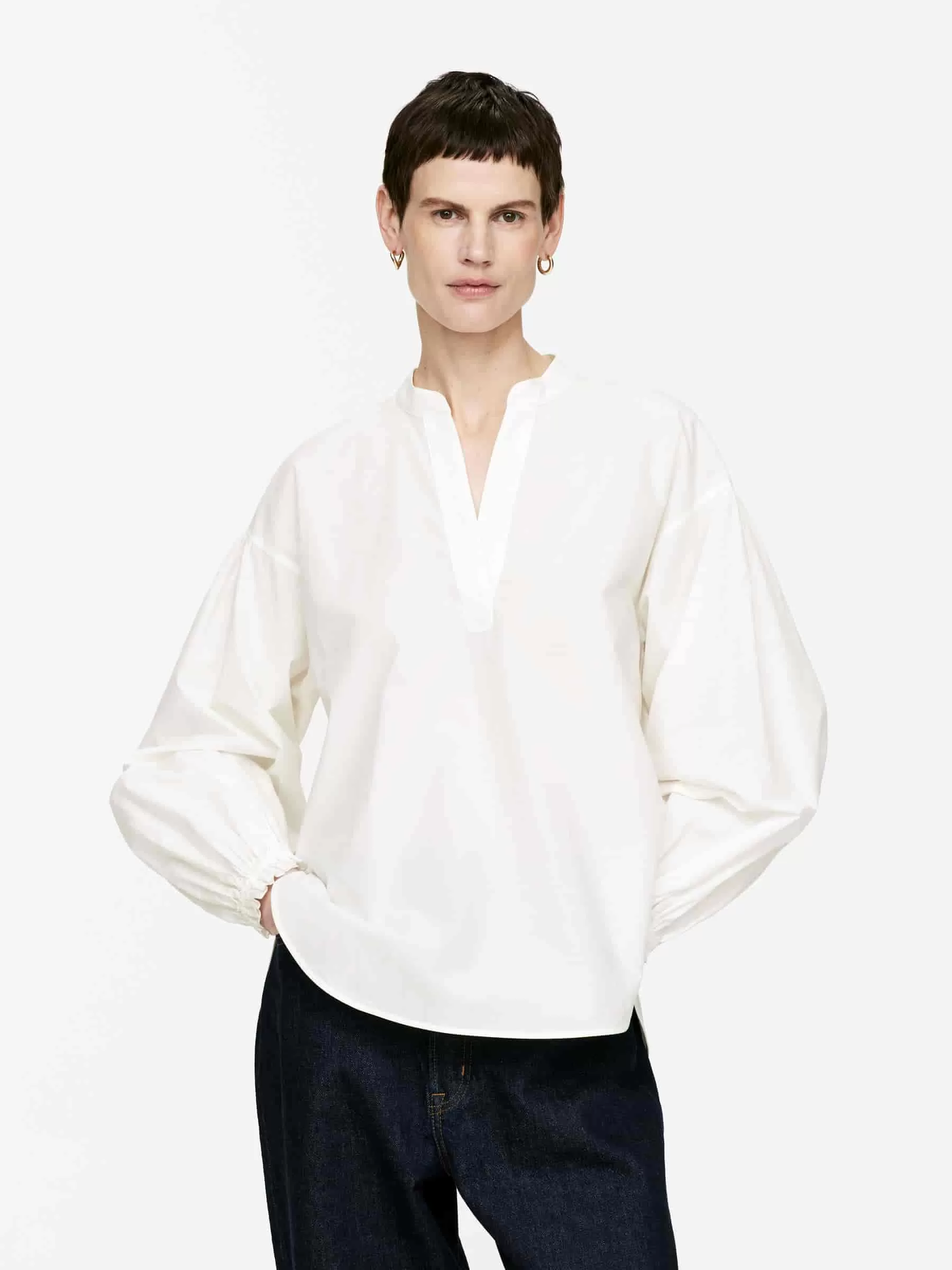 Baumwollbluse mit V-Ausschnitt, voluminösen Ärmeln und Raffungen an den Manschetten. Normale Passform.